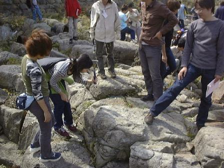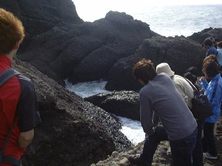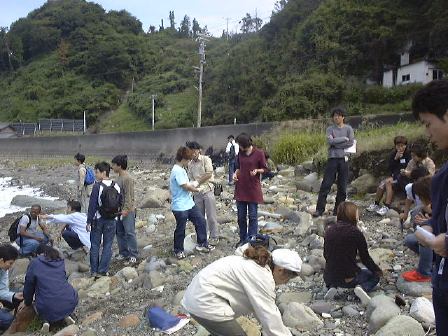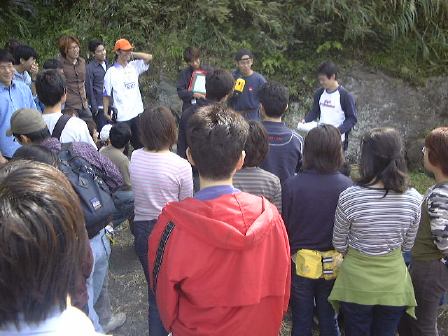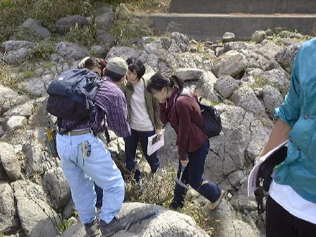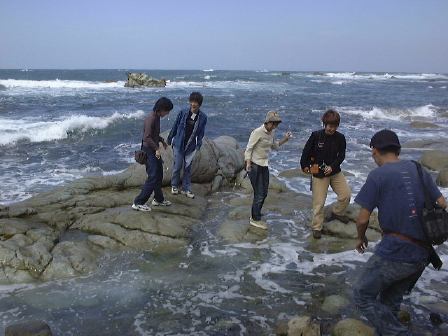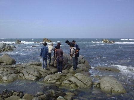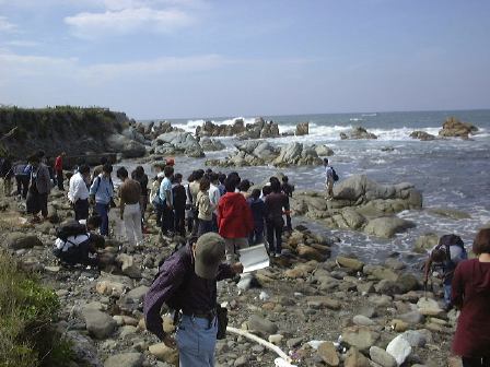 越前海岸2つ目の見学ポイントへバスおよびプラドに乗り移動。今度は堆積岩に見られる堆積構造の観察です。露頭を前に説明を受けながら、10分ほど思い思いに観察しました。潮の流れの往復で交互にできたこんな斜交葉理が見られたります(見にくいですが)。その後、向側の海岸に降りて、火山灰が堆積して固まってできた凝灰岩や貝化石などを含む砂岩の観察に移りました。離れ小島に渡る人が数人いたり、岩石を割って化石を探す人たちもいたり、と思っていたら離れ小島の人々は波をかぶってビショ濡れになりました。日頃の行いが悪いのでしょうか(笑)。この時点ですでに正午は過ぎていましたが、続けて越前海岸3つ目のポイントへ再び車に乗って向かいました。そこでは2班に分かれて、地質学的なことと地球化学的なことの解説を学外セミナ委員がしました。海岸の少し離れたところで2つのグループが同時進行でそれぞれ解説をし、ひと班が終わったら入れ替わってもうひと班が解説を聴くという形です。で、にわか委員になっていた私は地球化学的な実験をT辺氏とともに担当したしだい。地質学グループの解説を遠くに見ながら、我々はこじんまりと実験をしました(Y下君撮影)。カールヘルムを着た人がいますね(笑)。直前に採取したバスの排ガスを溶かした水や海水のpH(ペーハー)をpHメータという装置で測ったりしたのですが、う〜んぎりぎりなんとか成功したと言えるでしょうか。評判はまずまずだったようです。