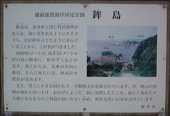 最終日の今日の見学場所はすべて日本海に面した越前海岸です。宿を出て2時間くらいで到着。まずは溶岩が冷え固まるときにできた柱状節理構造を持つ石英安山岩が見られる国定公園の鉾島です。柱状節理とは名前の通り、溶岩が冷え固まるときにできた割れ目によってできた柱状の構造で、温度や溶岩の粘性などによってその大きさが決まってきます。おそらく一番安定な力のバランスを取ろうとするためか柱はたいてい六角柱の形状をしています。鉾島一帯を見渡した全景はこんな感じですが、風が強くとにかく波が激しい日でした。左側の島には頂上まで登れるようになっていて、近寄って見上げるとこんふうで、さらに登っていき、下を見るとこんな荒れ模様。東側には数回に渡る陸地の急激な隆起によってできたと考えれている海岸段丘を見ることができます。ひとしきり潮風を浴びてから順々に下に降り、引き続き岩石の観察に移ります。ハンマーで岩石を叩いたり、詳しい人に教えてもらったりすること10分くらい。最後に島をバックに並んで記念撮影。道路に戻るとそこには警戒心の強い野良犬がいてバスガイドさんがエサをやっていました(にこにこ)。あと、こんな看板がありましたが、海を守る子供達がなんか不自然。大人が率先して守ってほしいものです(笑)。