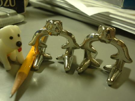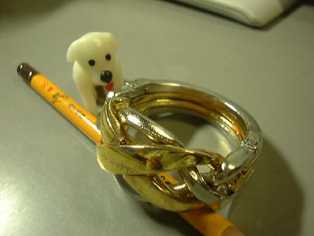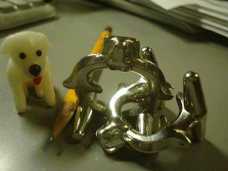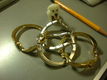 そして夜は溜まっていたテディたちの写真を撮ってページを更新。先日来、一部でブームになっている知恵の輪ですが、それらの一部の写真もついでに撮ってみました。一番難しいと言っていた代物の解く前がこれで、解いた後がこれ(1分あれば解けるまでになりました)。それから新たに研究室に持ち込まれた知恵の輪(?)がこんなやつで、4つのリングが繋がっています。これはリングを外すタイプではなく(それは破壊しない限り不可能)、形を組み上げるタイプなのです。最初、完成形を見ないままいろいろ触っていたときは、どうすればいいのか皆目見当がつきませんでしたが(笑)、後に完成形を確認してからはなんとか組み上げることに成功。その完成形がこちら。しかし、こんなことやってる場合じゃないと思いながらも、つい手が伸びてしまうのは困りもの。そのエネルギィを家の給湯器を修理する方向に向けて欲しいものです(他人事か)。