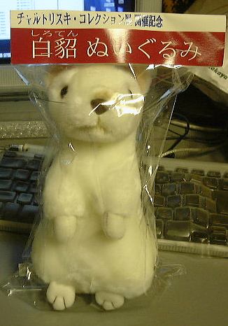 美術館の出口には記念品の数々が売られています。ポスタとか鏡とかキーホルダとか絵はがきとか「白貂を抱く貴婦人」の絵をあしらったグッズが目白押しです。ダ・ヴィンチにちなんで「モナ・リザ」の絵もグッズにあしらわれてます。ちょっと作り過ぎちゃうの?ってぐらい(笑)。まるでキャラクタ商品ですね。そんな中、迷わず買った物はもちろん、「白貂を抱く貴婦人」にちなんで白貂です。別名オコジョ。いやあ可愛いですね〜(にこにこ)。っていうか、散々美術品見ておいて結局買ったのはぬいぐるみかよ!(笑) ふっふっふ、これを抱けばいつでも「白貂を抱く貴婦人」になれるのです〜。ただ問題は、どうやって貴婦人になるかってことですが。