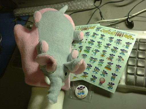 (11/13) 雲が空高く浮かぶ晴れの火曜日。午後から授業がある日です。だからといって昼まで寝てて良い道理はないですが、ぐっすり寝てましたね(笑)。ちょうど正午ぐらいに目覚め、午後1時からの授業には食事なしでなんとか間に合いました。ちっとも生活が改められる気配は感じられません。しかし、昼まで寝ているメリットもあるもので、今日はポストに入らない郵便物をお昼過ぎに直接配達員から受け取ることができました。何かと思ったら、少し前にテディを里子に出した方からのお届けものでした。入っていたのはこの品々。左に写ってるのはお風呂で手にはめて使うスポンジのようです(象と思われるキャラクタがついてます)。銭湯で使うのはちょっと恥ずかしいので(笑)、これは家の給湯器が治ったら使わせていただくことにしましょう。そして右に写っているのはシールとカンバッヂ。三重で開かれていたスポレク2001みえのグッズのようです(もう終了したようですが)。わざわざお送りいただいてありがとうございます〜(>三重のGさん)。