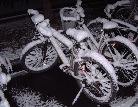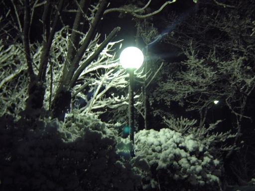 昨夜、帰宅したのは午前3時頃だったのですが、その頃にはもう雪が降り終わっていました。しかし、自転車が屋根のない駐輪場にオキッパだったので、すっかり変身してこんな有様に(こんなこともあろうかとわざわざデジカメをポケットに入れていた)。雪が積もっても不思議と自分の自転車は見分けられますね。気品が漂う美しいフォルムだからでしょうか(笑)。自転車は乗っている人の性質に似てくると言いますからね(言わん言わん)。それから大学構内のある電灯の周りに浮かび上がる雪とかも撮ってみたり。雪国の人にとっては珍しくもなんともないのでしょうが、夜が明けたら溶けて無くなるだろうなという予感があったので、寒い中我慢して写真に納めておいたしだい。案の上、翌朝には雪はほとんど無くなっていましたね。起きたのは昼過ぎでしたけど(スピードスケートを観ちゃったから)。
