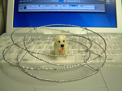 それから針金を買ったのは、「捩れ屋敷」の模型を作ってみたかったからです。「捩れ屋敷」というのは森先生の著作「捩れ屋敷の利鈍」に出てくる建造物の通称で、裏表の境がないメビウスの輪が厚みを持った形をしている代物です。本を読了後、作ってみようかなとぼんやりは考えていましたが、某所で「捩れ屋敷」の模型を作れないかという話題が上がっていたことで、一念発起して自分が提案した針金で作ってみることにしたしだい。その夜は大工作大会となりました(もちろん独りで)。「捩れ屋敷」はメビウスの輪の構造をしているために、設計図を画くことからして大変ですが、頭の中にはだいたいのイメージがあったので、面倒臭い設計図は画かずにいきなり作り始めてみました。想像の段階では針金で簡単に作れるんちゃうの、みたいな印象を持っていたのですが、これがいざ作り始めてみると、大変な労力を必要とする作業となりました。まず、「捩れ屋敷」を作る以前の問題で、針金を丈夫にしようと2本を捩って太くすることから始めたのですが、この行程に半分くらいの時間を費やしてしまいました。さすが捩れ屋敷です。一筋縄では作れません(でも針金では作れます)。全然長さが稼げなかったので当初の予定よりも模型のサイズを小さくすることにして、捩ったりひっぱたりペンチで曲げたりを延々4時間ほど続け、苦労の末、午後11時半頃に、ようやくなんとかメビウスの輪の形になったのがこちら。ところどころ歪んでるのはご愛嬌。ここからまだ針金で補強していく予定です。途中で指の皮が水膨れになって剥けたりもしましたが、久しぶりの達成感を味わいました(にこにこ)。いやあ、やっぱり創造的な作業ってのは楽しいなあ。