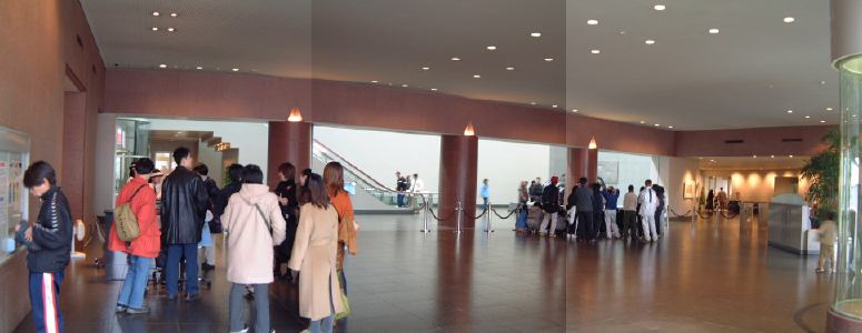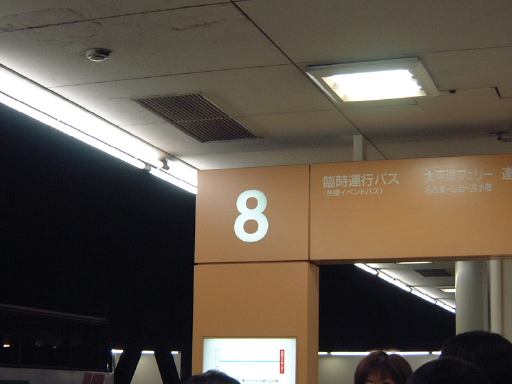 さて、余裕の足取りで10時40分ぐらいに、シャトルバスが出発する予定の8番乗り場に到着してみると、そこにはすでに幹事のKずえさんとTさんとMつるさんとLさんとSーなさんが集まっておられて、井戸端か・・じゃなくて、えーと優雅に談笑されていましたことよ、おほほほほ(<誰?)。幸い他のお客さんは2、3人ってとこで、全員乗れそうです。そうそう、前回に引き続き千葉から遠路はるばるやって来られたGんてつさんもすでにおられて、独り灰皿のあるところで煙草を吸ってらっしゃったのでした。まだ出発までに時間はあります。しばらくしてやって来られたのがFさん。8番乗り場はこんな感じ。さらに待っているとAなあなさんにMさんが来られて、これで10人集合。まだ来ていない残る1人は誰だったか・・あ、そうだ、Kつさんです。さらに待ってもなかなか現れません。ひょっとしてもう現地に行ってしまったのではないか?とかいろいろ疑惑が生まれていましたが(笑)、そうこうするうちに出発時間も迫ってきました。さあ、果たしてかつさんは乗り遅れてしまうのか、という心配もありましたが、ここで思わぬアクシデントが発生。我々が待っていた8番乗り場の近くに普通サイズのバスが停車していたのですが、そのバスは別に8番乗り場から出発予定だったわけでもなかったようで、後ろから来るバスの邪魔になっていたみたいなのです。で、ついにセンタ内に「***番のバス、移動して下さい」とかいうアナウンスが響きました。しかし、そのバスは一向に動こうとしません。無人ではありません。運転手もちゃんと乗っています。が、よく見ると、その運転手は合歓の木だったのです(って植物かよ!しかも読めないと駄洒落だと気づかれないぞ)。じゃなくて、眠っていたのです(笑)。それで全然アナウンスが聞こえていない様子。結局を目を覚ましたのは、何度目かのアナウンスの後、外から直接声を掛けられてからでした。疲れていたんでしょうね。