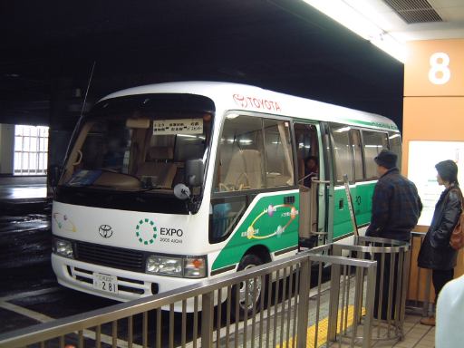 そんな騒動(というほどでもない)もあったりで、午前11時になると目的のシャトルバスが乗り場に入ってきました。これが、そのトヨタ・ミュージアム・ライナー。形は普通のこのマイクロバス、乗ってから判ったことですがハイブリッド方式の電気バスなのです。説明によるとエンジンを効率の良い状態で常に回して発電し、その電気でモータを回して駆動するという仕組みらしい。せっかくのエンジンの回転エネルギィが、電気に変換されて再び回転エネルギィになるというのは、素人目にはなんとなく2度手間なような印象を受けてしまうのですが、実際のところどうなんでしょうね。採算が取れるのかどうか気になるところ(自家用じゃなければ問題ないのかも)。それにスピードを出すときにちょっと馬力が足りないような感じもしました(制限速度を守っていたからかもしれませんが)。という話はいいとしまして、何か忘れてませんか? そう、Kつさんです(笑)。Kつさんが出発時間間近になっても全然現れないのです。しかたなしに、代表のKずえさんがリストに名前を書いて、とりあえず我々10人はバスの中に乗っておきました。他のお客さんも4人くらいいます。で、待つこと数分。ああ、ついに時間となりました。残念ながら、結局Kつさんは姿を見せず、乗り場のゲートも閉じられます。そして、バスのドアも閉まろうとしたそのときでした。なんとまさに時間ぴったりギリギリ到着です!Kつさん。意外な方向からひょっこり現れて、運転手さんにゲートを開けてもらい、無事バスに乗ることができたしだいであります(良かった良かった)。どうやら名古屋駅に向かうバスが遅れていたようで、予想外に時間がかかってしまったみたいです。なにはともあれ、バスの中に那古野コネクションメンバがちゃんと11人いる!(<萩尾望都?)状態で名鉄バスセンターをあとにできました。