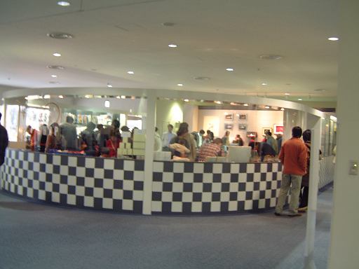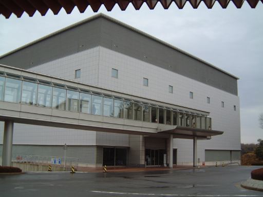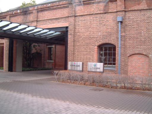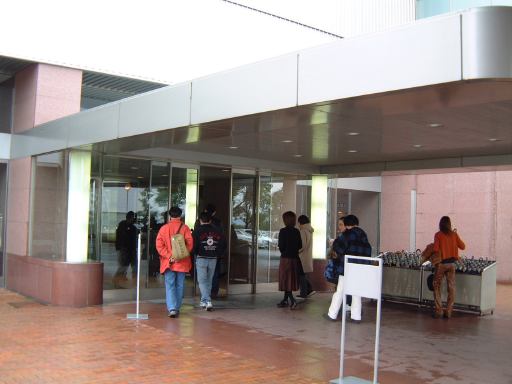 無事11人揃って名鉄バスセンターを出発した那古野コネクションメンバでしたが、バスの後ろの方に陣取った女性陣がいきなり盛り上がっていましたね〜。さすがです。すでにバスの中は楽しい遠足の様相を呈しています(我々だけですが)。途中バスは、名駅から10分くらいのところにある産業技術記念館(入口付近を車内から)に寄り、そのまま10分くらい停車しました。そこで他のお客さんが2人ほど降車。11時25分、ほとんど貸切り状態になったバスは産業技術記念館をあとにし、一路トヨタ博物館へ向けてひた走るのでありました(キュイ〜ン<モータ音)。車内では、この電気バスのことや産業技術記念館やトヨタ博物館などについての解説がしばらく流れていたのですが、だ〜れも聴いちゃいませんね(にこにこ)。わいわいがやがや、焼肉食べたいなあという話とか、その他もろもろの話題で夢中なのでした。その熱気で窓が曇ってしまったほど(笑)。そして、バスはなんと都市高速を走って(考えてみれば当然ですが、無料なので地道を走るかと思っていた)、すーいすいと一気に長久手町の方まで辿り着き、12時過ぎにはトヨタ博物館に到着しました。雨は小降りになっています。バスを降りた一行は、さっそく本館入口から入って行きます。ちなみに振り返れば、1999年にトヨタ博物館開館10周年を記念してオープンしたという立派な新館が見えますが、そこの紹介はまた後ほどで、まずは本館です。