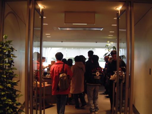 節分の日の日曜日は午前8時頃に起床。那古野コネクションの定例オフ会の日ですが、まあまあの早起きができてほっとひと安心。今回は余裕をもって出かけられそうです(笑)。しかし外はあいにくの雨(予報通り)。朝食を食べ、お風呂に入り、ささっと着替えて傘が家にないので雨に濡れながらとりあえず大学へ。着いてすぐに気になる実験装置の様子を見て、しばらく目を離していられるように手を施しました。そして、夜のうちにオフ会に持って行く小物(名刺、デジカメなど)はまとめてバッグの中に準備してあったので、バッグごとリュックの中に入れて10時過ぎには地下鉄の本山駅へ向けて出発できました。先日傘を盗られたと言いましたが、実は研究室には折畳み式の傘が置いてあったのです(最近思い出した)。ということで、それをさしながら、駅まで何故か走って行きました(集合時間に遅れる心配はなかったにもかかわらず)。これまでが時間ギリギリの出発を繰り返していたために、行きはついつい走ってしまう癖が付いたのかもしれません(笑)。そのおかげで雨にも少し濡れました。傘さしてた意味なしですね。小降りだったからよかったですけど。地下鉄で名古屋駅までは約15分、そこからは集合場所である名鉄バスセンターへ歩いて向かったのでした。いつになく余裕の歩きです。う〜ん、余裕があるってすばらしいなあ!(にこにこ) 近鉄パッセ前のナナちゃん人形も裸でしたしね(関係ない)。