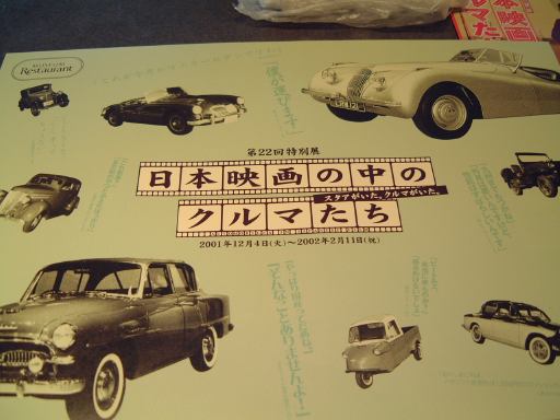本館に入ると、1階には広いロビィが広がっています。右奥では、別の団体がガイドツアーを説明をお姉さんから受けている模様。チケットは左手の方で買うようになっているのですが、このときはKずえさんが割引券みたいなのを持っておられて、とりあえずみんなの分がまとめて支払われました。そして、受付済スタンプを押してもらったパンフレットをそれぞれが持ち、入場。入ってすぐのところはシンボルゾーンとなっていて、トヨタ博物館のシンボルであるトヨダAA型乗用車が展示されていますが、お昼時ということもあり、展示物の見学を始めるのは後ほどにして、まずレストランで腹ごしらえとなりました(笑)。本館は上から見ると(下からでもいいけど)トラックのような形をしていまして(乗り物の方ではなく陸上競技に使われる方)、その片方の半円形になっている部分の頂点を中心にバームクーヘンを中心角60度くらいで切り取ったような形でレストランがあります。その入口からぞろぞろと中に入り、4人掛けのテーブルが3つ並んだスペースに我々11人は陣取りました。つまり4、4、3という配置。お昼時だったので、しばらくして満席状態となりました。メニューは、Sーなさんが事前に美味しいとおっしゃっていたカレーライスが数種類に、ピラフとかエビフライとかシーフードドリアなどなど基本的に洋食で、どれも1000円ぐらいのお値段。サラダとドリンクをセットにすると1200円(税別)でしたが、みんなセットを注文したようです。さて、水が運ばれて来るまえに、ウエイトレスさんによってテーブル上には各々の前にA3大の紙のシートが敷かれたのですが、これがまたコレクタ魂をくすぐる代物で、トヨタ博物館で催されている特別展のチラシになっているのです(しかも2バージョンありました)。この特別展はある期間ごとに内容が変わるもので、今は写真に写っているように「日本映画の中のクルマたち」というテーマで展示がなされているようです(後ほどそこも見学することになります)。他のテーブルのメンバはどうだったか判りませんが、我々(Gんてつさん、Fさん、Sばしん)のテーブルでは、そのシートを綺麗な状態で持って帰ろうと、代わりにいくらでもあるトヨタ博物館のパンフレットを広げたり、上から別のパンフレットを敷いたりして、水の入ったコップについた水滴も付かないように手を施していましたね。ひょっとしてこのシートとして使われていた特別展のチラシを持ち帰ったのって、我々3人だけでしょうか(笑)。