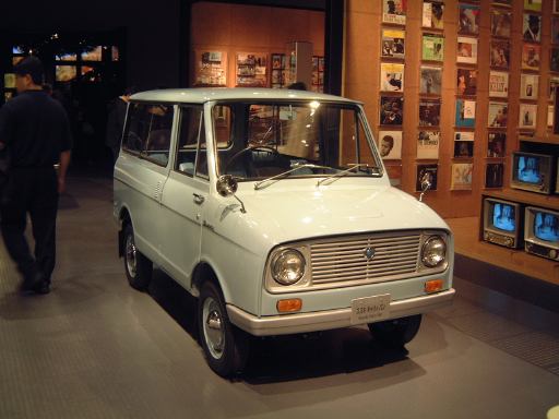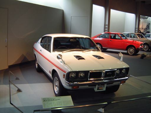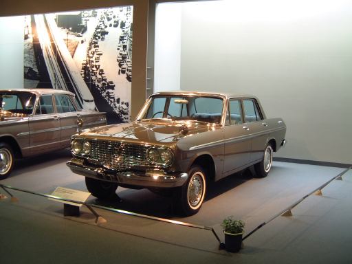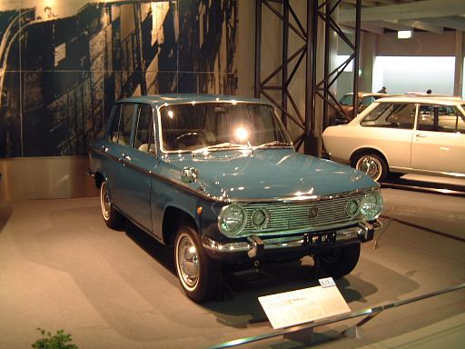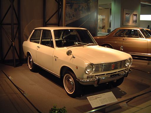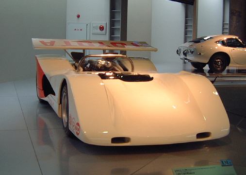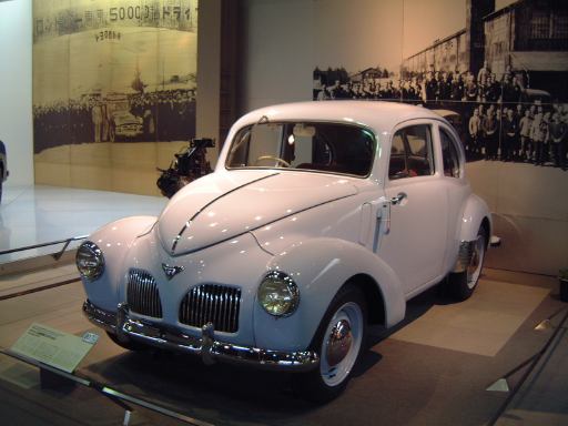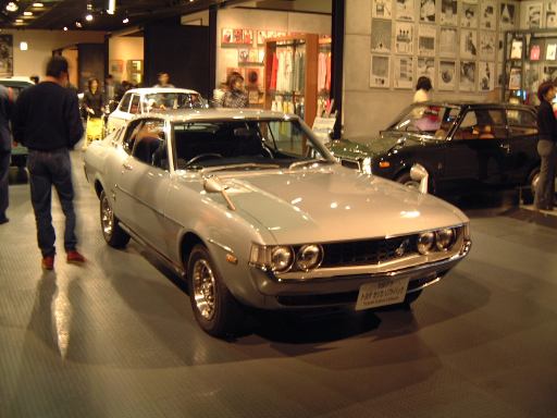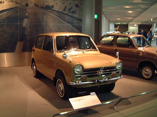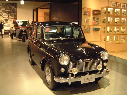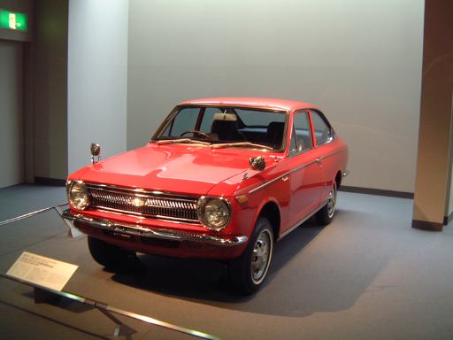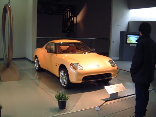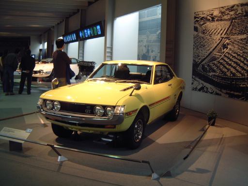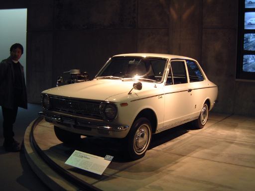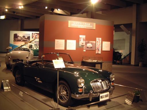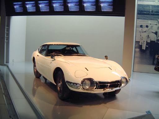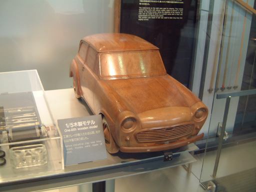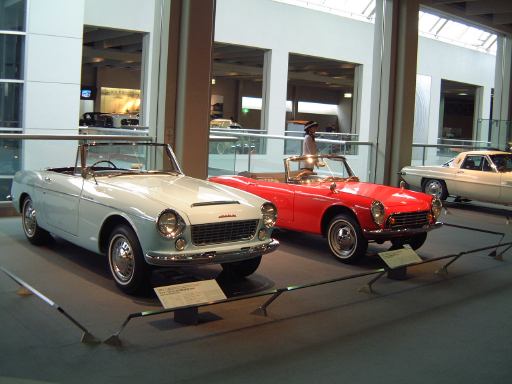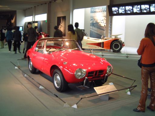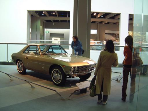 さて、3階は日本車の展示が中心となっていて、5つのゾーンに区分されています。1つめは「日本人の手による自動車生産」で、トヨタ・AB型フェートンや、日産の初期の生産車ダットサン・16型・セダンとか、一般公募で決定された愛称が名前になったトヨペット・SA型乗用車や、トヨペット・スーパー・RHN型(右)とトヨペット・クラウン・RS型(左)などがあるなか、片隅には大正時代のオートモ(復元)やガソリン給油機があったりします。それから軽自動車では、オフロードっぽいフライングフェザーや一つ目小僧のフジキャビン・5A型に、後ほど聞くところによると女性陣に人気の高かったコニー・グッピー・スポーツなどが展示されています。2つめのゾーン「大衆化のための技術開発」に入ると、日野・コンテッサ・PC10型や、マツダ・ファミリア・SSA型、ダットサン・ブルーバード・P312型(左)に、トヨタ・カローラ・KE10型とかダットサン・サニー・B10型など、今も残っている名前のクルマが多くなってきます。3つめのゾーンは「多様化するニーズへの対応」ということで、トヨペット・クラウン・RS41型とか、軽のホンダ・N360・N360型やスズキ・フロンテ・360とか、豪華なトヨタ・センチュリー・VG20型とか、トヨタ・カローラスプリンター・KE15型とか、ニッサン・シルビアに、三菱・コルト・ギャランGTO-MRなんかが展示されています。あと、自動車のデザインに関して説明されている一角には、クルマの1/5木製モデルなどもありました(これ欲しいなあ)。それから、トヨタ・セリカ・TA22型は、ひとりひとりの異なった要望にも対応できるフルチョイス・システムなるものが採用されたらしく、たまたま通りかかったガイドツアーのお姉さんの話によると(つまり盗み聴きしたわけやね)、全部で約3000通りの組み合せがあるとか(でも、聞き間違いかもしれない)。また、ここに限ったことではないですがこういったポスターもところどころで見かけますね。さらに先に進むと「高性能スポーツカーの開発」というゾーンになり、ホンダ・S500・AS280型(右)やトヨタ・スポーツ800・UP15型がありーの、多くの伝説を生んだトヨタ・2000GT・MF10型(そしてそのエンジン)がついにお目見えするわけです(じゃじゃ〜ん)。日本グランプリに出たトヨタ7(とそのV8エンジン)はその横に。最後のゾーン「未来へのステップ」では、軽量化と高効率を追求したトヨタ・AXV-IVと、2人乗り電気自動車のトヨタ・e-comが展示されています。両方とも時期は違いますが東京モーターショーに出展されたクルマです。e-comの方に写っているAなあなさんとLさんはガイドのお姉さんにいろいろ質問していましたね(お、上手いこと撮れてるやん、ガイドさん<何にフォーカス合わせてるのか)。
