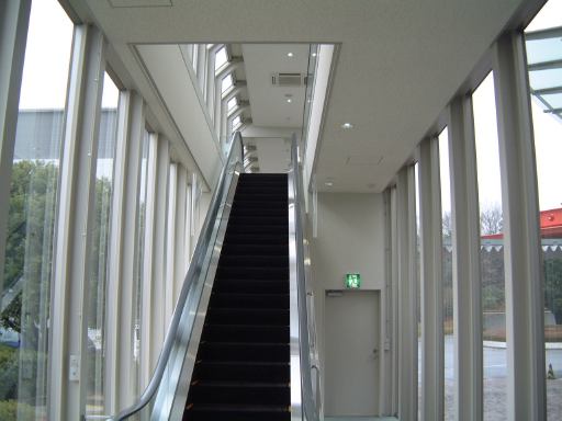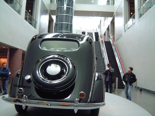 <家族クイズ>を耳にした時点で集合時間まですでに1時間を切っていたので、ひとまずクイズは棚上げにし、新館へと急ぎました。再びエスカレータで1階まで降り、シンボルゾーンを抜けて新館へ続く道を行きます。その途中には、乗ることもできるクラシックカーローバー・6HPが展示されており、その先にエスカレータ、そしてここを上がると新館への渡り廊下となっています。さて、ここからが本番です。って、冗談ですよ(笑)。あでも、新館が建ってからトヨタ博物館を訪れたことがない方(たとえば森先生とか)には、多少のイントロダクションになるかもしれません。というか、はっきり言って、ここからは森先生に捧げるバラードなのです(バラードなのか)。