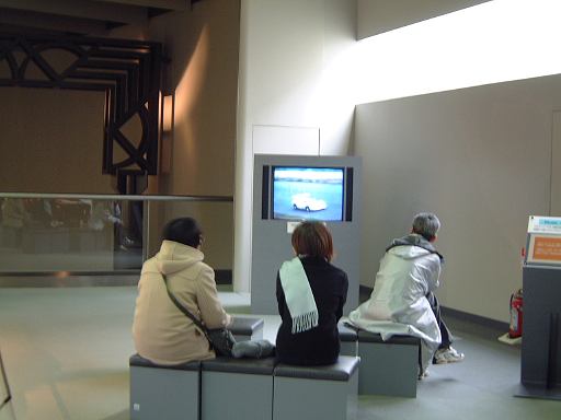 そうこうしている隣のスペースでは、ビデオが上映されている前でこのお二人が何やらおしゃべりをしていました。MつるさんとMさんのようです。あ、右のおじさんじゃないですよ(笑)。近づいて聞いてみるとどうやら何かのクイズのようでした(また盗み聞きか!)。このクイズについては、帰りのバスの中でMつるさんより詳しい説明がなされたのですが、ここで先に書いておきましょう。ええと、便宜上、勝手に<家族クイズ>と命名させていただきます。一度くらいなら聞いたことがあるかもしれませんが、そのクイズとは以下のようなものです。