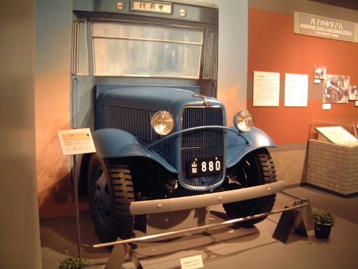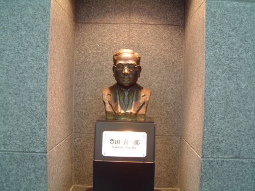 でもってようやく3階へ。エスカレータを上がっていくと正面にトヨダ・AA型乗用車がお出迎え。1階のシンボルゾーンにあった最初のクルマと同じですが、実はそっちはトヨタ自動車の創立50周年を機に復元されたものでした。というわけでこっちが本物のトヨタ初の生産車。すべて国産の技術で造られたもので、1936年に発表されたらしいです。しかし、最初からこの流線形で自動車を創ろうとしたところが凄いですね。ちなみに創業者の豊田喜一郎さんはこんな人。