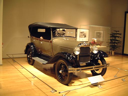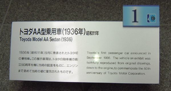 では昨日の続きで、解散をしてからの話。ここからは基本的にバラバラになって見学したので、たまに遭遇する以外はメンバが登場することはほとんどありません(あしからず)。本館はざっと見て新館を重点的に見学されたのちに、カフェでおしゃべりに興じていらっしゃった方や、新館の方から見学され思わぬ収穫を得た方など、めいめい好きなように展示物を堪能されていたようです。一方、記述者である私はこれまでに2度見学に訪れていましたので、今回はひとつひとつをじっくり見ることはせずに、とにかく「森先生のコレクション」を少しでも多く写真に収めようというのが主な目的でした。というわけで初めから終わりまで脇目も振らずに撮りっぱなしです(笑)。まずはさきほど通り過ぎた本館1階のシンボルゾーンに展示してある、最初のクルマトヨダAA型乗用車です。なんかお姉様方も一緒に写ってますが(笑)、いやあ、ぴかぴかに磨いてありますね(お姉様方ではなくてクルマの方ね、って藪蛇だったか)。足元にはこういう解説プレートが設置されています(常設展示に関してはこれがクルマごとに付いてるわけです)。ちなみにプレートの右上に付いている番号は専用の端末をレンタルして聴くことができる音声ガイド用の番号だと思います。さらに、後ろに回って本館の2階、3階を望みつつ後方からこのクルマを見るとこんな感じ。ちゃんとタイヤホイールにもTOYODAと刻字されていますね。本館中央にあるエスカレータで2階に上がると、いよいよ本格的な展示スペースが広がっています。この本館の展示では、ガソリン車が誕生した19世紀末から20世紀の自動車の歴史を実用車を中心に、約120台(2階欧米車、3階日本車)の車両により、体系的に展示されているとのこと(パンフレットより)。それでは、まずは2階から。