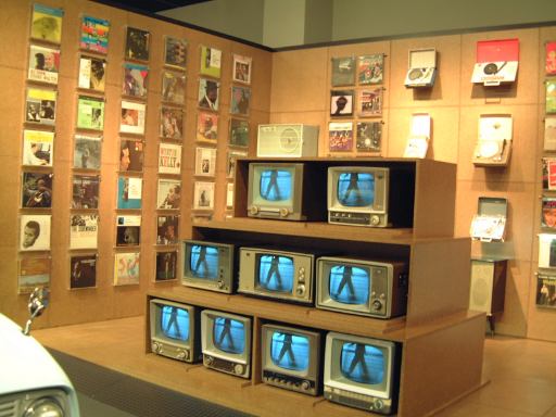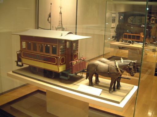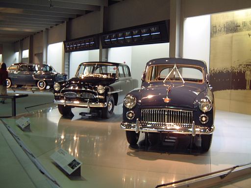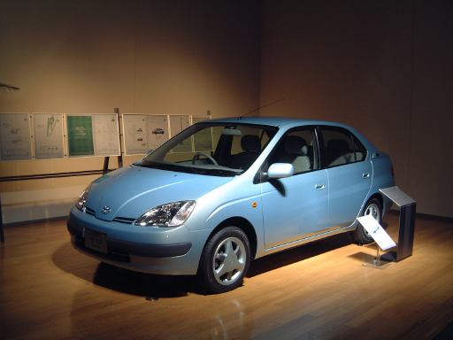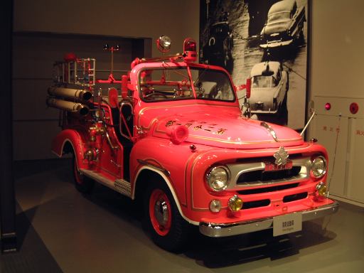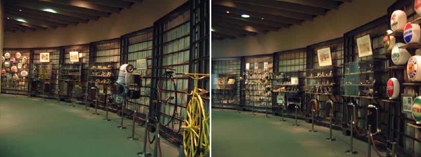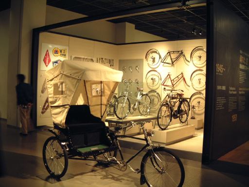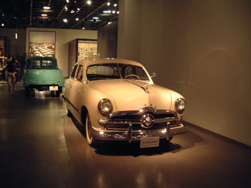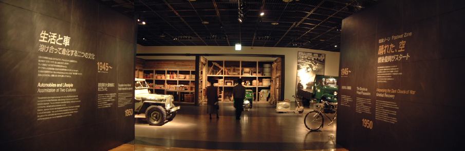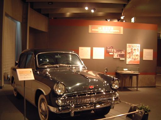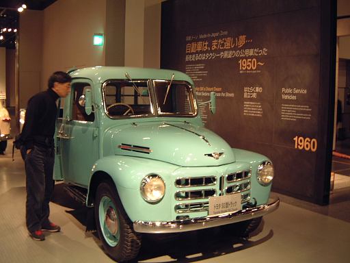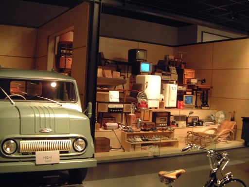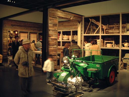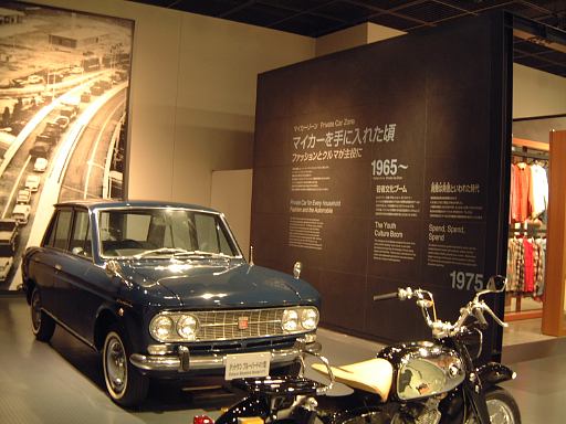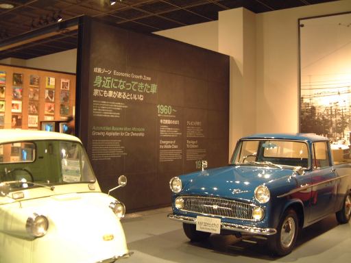 渡り廊下を突き当たると、左側に新館の入口があって、2階から入るようになっています。入口からはこのような眺めで、正面に見えるのは、明治時代に日本に入ってきた蒸気自動車ロコモビル・スチーマーです。新館は、自動車と人々の暮らしの関わり合いについて、明治から現代までの生活文化の変遷に沿って6つのゾーンに渡って展示されています。最初は「開花 移入 産声」というテーマの明治〜昭和初期・前史ゾーン。ここには大八車や人力車から、最初に日本に輸入されたというパナール・ルヴァッソールや馬車鉄道や蒸気自動車やT.G.E・トラックA型などの模型に、日本製のフォードA型とかまで置いてあります。この中で一番欲しいのは馬車鉄道の模型ですね(笑)。さて、次は「晴れた、空」というテーマの1945-50・戦後ゾーンとなって、ここからは車よりも生活の方の展示物が多くなり、ジープと酒屋、耕耘機と農家とか、三輪車と自転車などのような展示方法です。詳しく見てみると当時の看板なんかも飾ってあります。通路にもフォード・カスタム・4ドアセダンが展示されていて、中には当時の雰囲気を出す小物が置いてあります。その先に進むと、「自動車はまだ、遠い夢…」というテーマの1950-60・国産ゾーンになり、通路にトヨタ・SS型トラック、奥の方には消防車や火の用心、トヨエースの隣には電化製品や雑貨がところ狭しと並べられています。沢山のカメラとその前にいるダットサン・211型や、部品とともにいるトヨペット・マスターライン・バンの前を通り過ぎると、右側に「身近になってきた車」というテーマの1960-65・成長ゾーン、左側にマイカーを手に入れた頃というテーマの1965-75・マイカーゾーンが現れます。前者では、レコードジャケットとその手前のスズキ・キャリィ・バンや、マツダ・キャロルの背後に子供雑誌とホビィの数々があったりします(ここに恐ろしいバットマンや怖い顔のイルカの絵があったとの噂ですが、残念ながら撮影できず)。後者では、当時の帽子やTシャツの数々や、その前にトヨタ・カローラ・KE10(にやけてる人が写ってます)とか、当時のアート雑誌やポスタ(未確認)に囲まれているホンダ・シビック・2ドアや、トヨタ・セリカ・リフトバックが展示されています。狭いところにいろいろ置いてある上に見学客も多いので少しせわしない感じでしたね(笑)。そして最後が「ステップアップ」というテーマの1975-・多様化ゾーンで、クルマはトヨタのハイブリットカープリウスが展示されているのみです。あとは、これまでの人々の暮らしとクルマに関するイメージ映像(たぶん)がひたすら流されているディプレイがあって、はい終わり〜。本館に比べて広くはないですが、密度の濃い新館なのです。