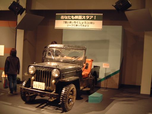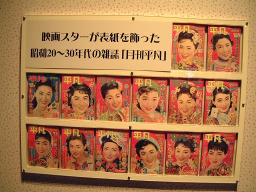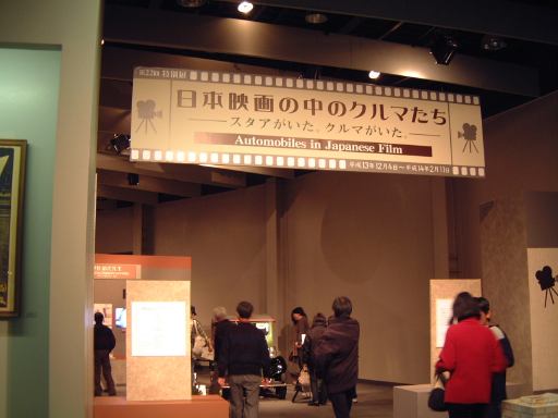 とはいえ、特別展は今だけなのでちょっとだけ詳しく紹介しましょう。本館2階のカーブ部分は二重になっていて、内側には自転車のマスコットや自動車に関連した小物が展示されていています(2分割写真)。そして、その外側で特別展の「日本映画の中のクルマたち」が開かれているのです。うーんと、どの映画も観たことがないので、もうひとつ感慨が湧かなかったのですが(笑)、映画や登場するクルマに関する資料とともに実物のクルマが展示されていました。入口から順に、「女医絹代先生」の中でお洒落にきめた絹代先生が乗って往診に向かうダットサン・15型・ロードスターや、「秀子の車掌さん」に出てくるガタゴトバスのフォード・BB型バス(フロントだけ)や、外車販売の女性セールス活躍物語「東京の女性(ひと)」に出てくるフォード・4ドア・スタンダード、それから「喜劇駅前団地」でも往診に使われるいすゞ・ヒルマン・ミンクスとか、「レッツゴー!若大将」で若大将が乗っているスポーツカーのMG・A・1600とか、「サラリーマン出世居太閤記」のトヨペット・クラウン・デラックスがあり、「憎いあンちくしょう」からはジャガー・XK120・ロードスターと記念撮影用の三菱・ジープ・J10型が展示されていたり、「稲村ジェーン」の可愛いダイハツ・ミゼット・MP4型もありました。それから、映画スターが表紙を飾った「月刊平凡」とかもいくつか展示されていましたね。