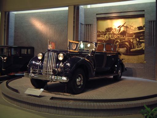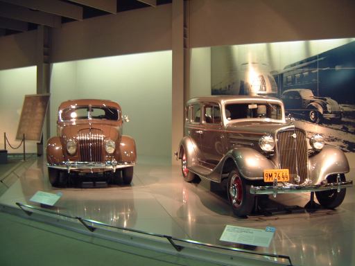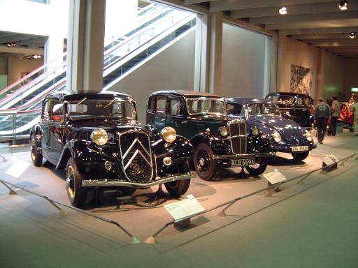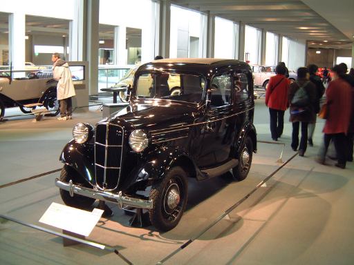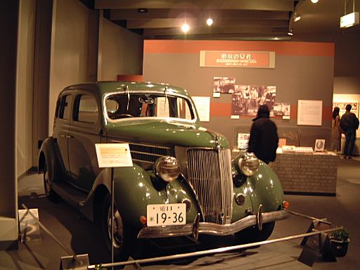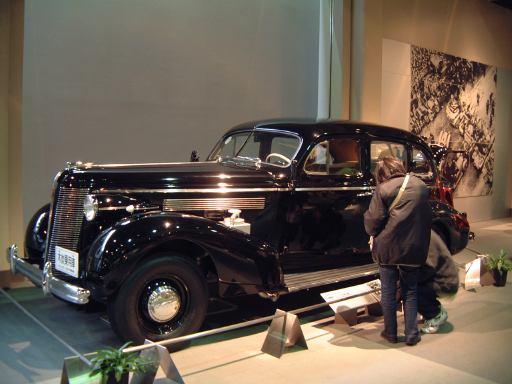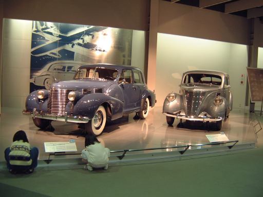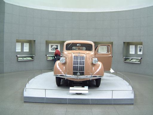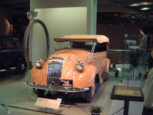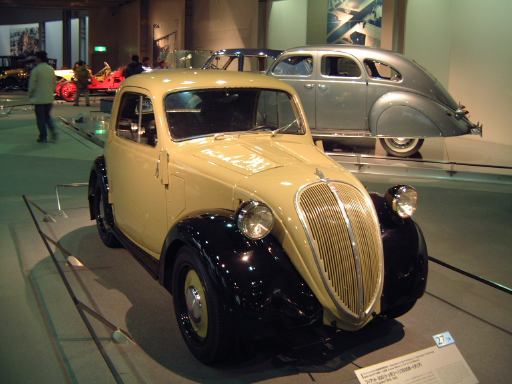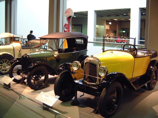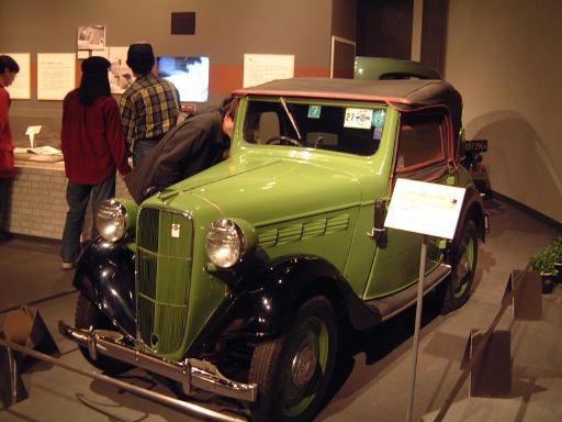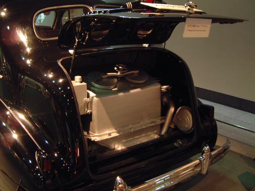 さて、特別展のスペースを抜け出すと再び常設展示が続いていて、そこは「量産・大衆化の実現からモータリゼーションの進展へ」というゾーン。ここにはエックス・コーチやシボレー・シリーズ490、フォード・モデルTや結構好みの形と色をしているシトロエン・5CV・タイプC3(右)なんかがあります。先に進むと、そこは「ファッション化から自動車技術完成へ」というゾーンになり、シボレー・マスター・シリーズDA(右)やフィアット500(トポリーノ)、シトロエン・11B(左)やキャデラック・シリーズ60スペシャル(左)などなど、現在のクルマに近いものが展示されています。あと、特別展示として再現された1937年型の木炭乗用車(そのエンジン部分)なんかも置いてあって、実際に動かしている場面がビデオで上映されていたりします。