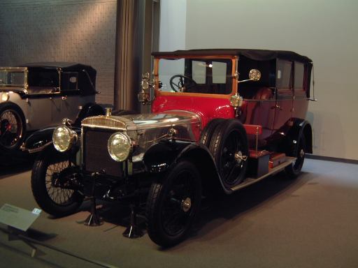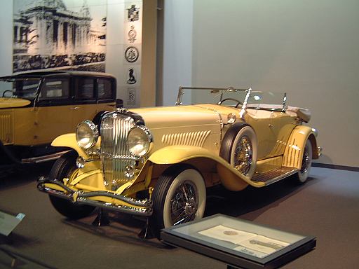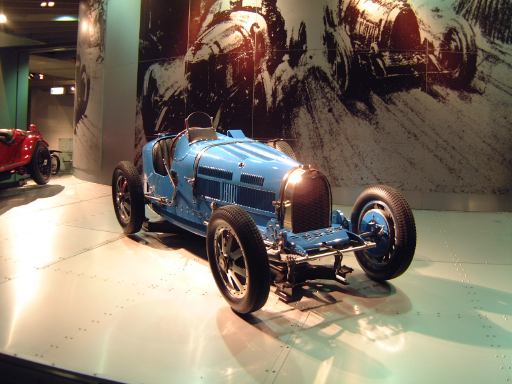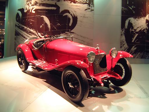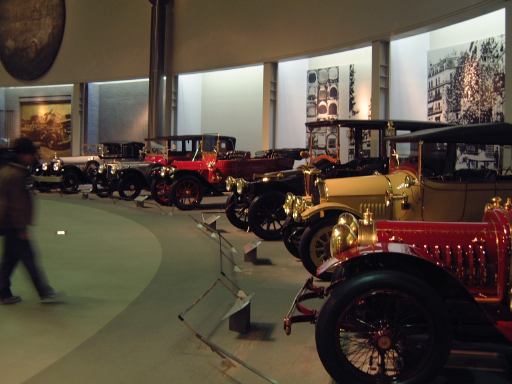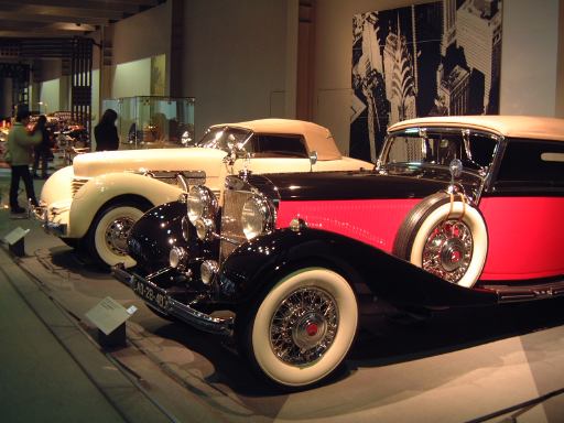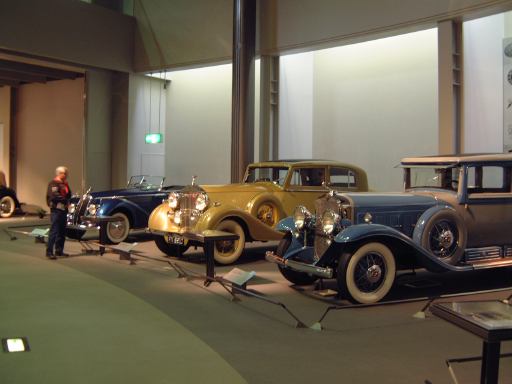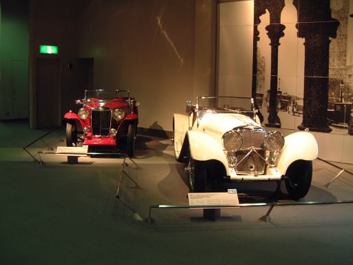 その先へ行くと再び建物のカーブ部分になっていて、その少し手前から自動車の進化とはまた別のテーマに沿ってクルマ数々が展示されています。通路を挟んで外側のカーブ部分が「ステイタスをのせた豪華な車」というゾーンで、カーブの内側を含む広い範囲が「速さと力にロマンを競った車」というゾーンになっています。前者の方には、このようにずらっと1910年〜1930年代のクルマが並んでおり、いかにも霧の街ロンドンに似合いそうなディムラー・タイプ45や、第32代アメリカ大統領のルーズベルト専用車パッカード・トゥエルヴとか、ちょっとお洒落なデューセンバーグ・モデルJなどがあり、キャデラック・シリーズ452A(右)やロールスロイス・40/50HP・ファンタムIII(中央)やランチア・アストゥーラ・ティーポ・233C(左)を3台まとめて撮影。一方後者では、速さと力を競ったものとして、気品が漂うイスパノスイザ・アルフォンソXIや、真っ赤なアルファロメオ・6C・1750・グランスポルト、その隣にブガッティ・タイプ35Bがあって、カーブ部分から出るとSS・ジャガー100(右)とMG・ミジェット・タイプTA(左)が妖しく並び、大衆のスポーツカーとして作られたツーシータタイプのモーガン・エアロが1段高いところに(少しぶれているのは、突然動き出したから。って、もちろんカメラマンがですが<しゃがみながらだったので)。あと、スタイリッシュな高級スポーツカーとしてメルセデス・ベンツ・500K(手前)や、目立つところにドラージュ・タイプD8-120が鎮座しています。前では子供たちが記念撮影。撮っているのはお父さん。そういえば日曜日だからかこの日は子供が沢山いて賑やかでしたね。展示されているクルマの名前を専用の冊子にチェックしていくゲームというかスタンプラリーもどきというか、そんなのをしている子供たちもいました。そうそう、それで思い出しました。博物館のパンフレットは子供用のもあるのですが、ちゃんとクルマの写真も名前付きで載っているし、普通のパンフレットよりも親切ですね〜という話をレストランで食事中にGんてつさんとしたのでした。もちろんこれももらってきてます(笑)。