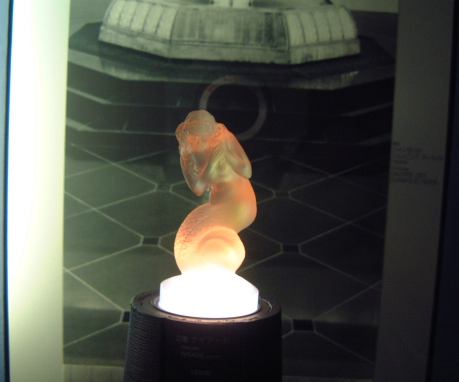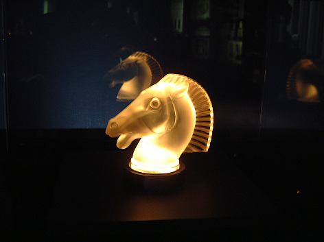 次に3階へ上がる前に、2階にある展示室に入りました。そこには、ガラス工芸デザイナルネ・ラリックが手掛けたカー・マスコット全作品が常設展示されています。カー・マスコットってクルマの前方に付いているやつですよね?たしか。つまりそれをガラスで作ったというわけです、ラリックさんが。で、その作品が展示されているのです(同じことを繰り返している)。部屋の中は暗く、ひとつひとつのマスコットには下から光が当てられていて、こんな感じ。たとえば、これが人魚で、これが馬。他にもワシとかカエルとかいろいろありましたが、それぞれに解説が付いているわけではないので、残念ながら毎回ここは眺めるだけなのです。