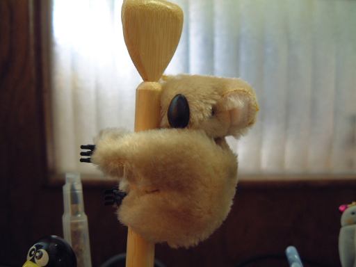 さて、シドニーと名古屋市の姉妹都市提携祈念碑みたいなのを通り過ぎた先にコアラ舎はあります。結構立派な建物で、さすがにメインだけあって扱いが違うことが伺えますね。建物の中ではカメラ・ビデオの撮影は禁止されていて、近くには常に警備員さんが見張っているという状況だったため、残念ながら可愛いコアラの写真は撮れなかったのですが、ちゃんとユーカリの木(たぶん)の上で幹にしっかりしがみついて、お尻を掻いたりしているコアラを見ることができました(可愛い〜)。ガラスの向こう側のコアラが居るスペースは結構広くて、いくつかパーティションが切られており、ひとつの区画に4本ずつくらい木が植わっています。それが8区画くらいあったでしょうか。しかし確認できたコアラは全部で5匹ほどでした。見るからに毛並みが良さそうで、「撫でたら気持ち良さそう〜」という声もありましたね。あ、さっき写真は撮れなかったと言いましたが、やっぱりどうしても写真に納めておきたいという気持ちは抑えられず、実は警備員さんが見ていないところでこっそり撮った写真があったりします(にやり)。それがこのコアラの写真です(ジャジャーン)。って、オーストラリア牛肉フェアか何かのときに生協で無料配布されていたコアラのぬいぐるみかよ!<ツッコミが長い! まあ、たしかに警備員さんは見ていないところ(大学の研究室)で撮ったので、嘘ではないけどさあ。なんてね、冗談はさておき(笑)、コアラ舎から出ると正面に上池が見えるのですが、そこには親子を背中に乗せたアンパンマンの姿が(ちょっと隠れています)。遠くにボート乗り場も見えますね。この池のほとりにはところどころに八重桜(たぶん)が植えられていて、葉の間にちらほらと咲いている花が、しっとり雨に濡れていました。平年通りに桜が咲いてくれていれば、公園内はちょうど見頃の時期だったんでしょうけど、ちょっと残念。