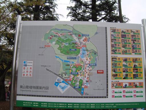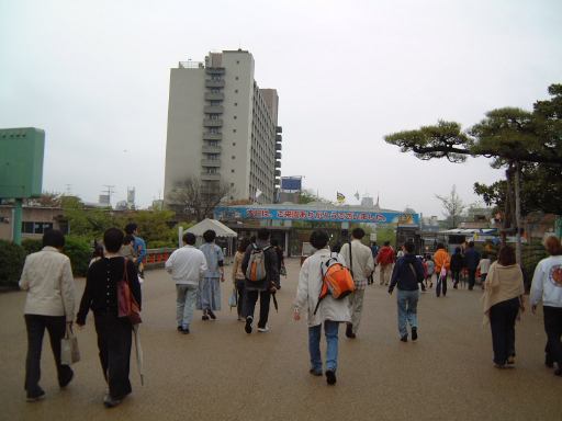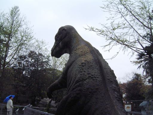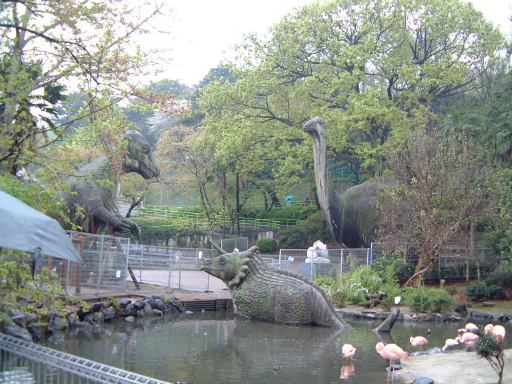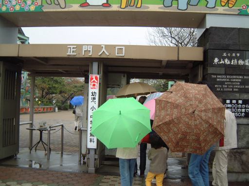 さて、一夜明けた日曜日は那古野コネクションの第11回のオフ会の日です。願いも虚しくまだ雨は降っています。。目覚めたのは午前11時頃で集合時間は午後1時でしたが、カレーをのんびり食べたりお風呂に入ったりしていたら、いつの間にか12時45分! うーわやば。これじゃまたまたオフ会の集合時間に遅れちゃうって。というわけで大慌てで家を出てまずは大学へ。荷物は大学の研究室に準備してあったからです。それと放っとけない実験装置にも手を施し、大学をようやく出発できたのが12時55分。がーん、残り5分かよ。間に合うかな、どうかな、などと不安になりつつ、とりあえず集合場所である東山公園の正門前へと急ぎました。途中の信号待ちも歯がゆいです(こんなときに律儀に信号待ちか)。な〜んていうのは全部言い訳ですね、はい(笑)。そういうロスタイムを見越して、もっと早くに家を出るべきでした(反省)。充分間に合う時間に起きていたにもかかわらず、なまじ近いだけに油断してしまい、結局集合時間にギリギリ間に合ったか合わなかったくらいに到着。雨に打たれながら自転車で坂道を下りてきて東山動植物園の正門前に登場すると、チケット売り場の前にすでに集まっておられた参加者の皆さんにいきなり笑われてしまいました(苦笑)。すみませんねぇ、近いくせにギリギリで。唯一の救いは、幹事のKずえさんもギリギリだったらしいということでしょうか(<こら、すぐに仲間を見つけて罪を薄めようとしないように!)。これまでに何度したかも判らない反省の数をもうひとつ増やしたわけですが、さらに追い討ちをかけるようにトホホだったのは、雨降りの日に自転車を飛ばして来たもんだから、カールヘルムのズボンがオイルやら泥やらで汚れてしまっていたのです(ぎゃふん)。とはいえ、この時点ではそんなことには気づく余裕もなく、息を切らしながらチケットを購入し、鼓動も速いまま入園となりました。入口の看板を見上げると、今は春まつりの期間中らしいことが判ります(でも具体的にどこが春まつりだったのかはよく判らず)。そう、もうお気づきでしょうが、今回のオフ会会場は東山動植物園(東山公園)です。そして、「数奇にして模型」の中で犀川先生が萌絵に対して出題した問題「アシカとオットセイの違いはいくらか?」を探りに行くツアーなのです(ネタバレありなのでご注意)。それが主な目的で、他に森先生の講座のホームページで紹介されている「東山公園の恐竜たち」の確認と、東山スカイタワーにも登るという目的もありました。なので、購入したチケットは少し安くなる入園料とタワー観覧料との共通券でした(800円也)。また、地下鉄を使って遠くから来られた方は、地下鉄のチケットもセットになってお得な「いこまいきっぷ」(1300円也)を利用された模様です。今回の参加者は、幹事のKずえさん、Tさん、Kつさん、Mつるさん、Fさん、Gんてつさん、Mさん、Aなあなさん、Lさん、Sーなさん、O崎フラグメントさん、そして私Sばしん、の総勢12名というメンバでした。久しぶりに大所帯。動物園に訪れるのは随分と久しぶりの方が多かったようです。