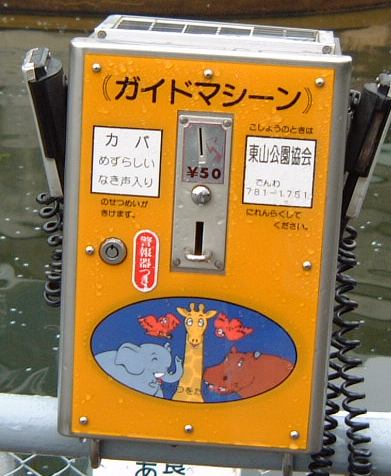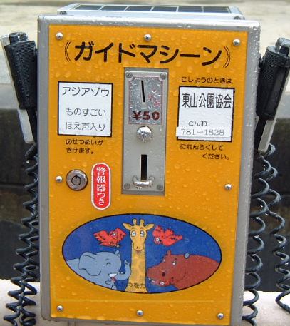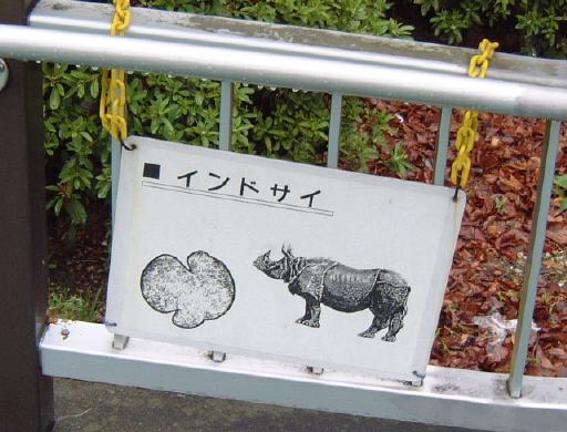 さて、幸か不幸かお天気がすぐれなかったため、この時期にしては断然入園者が少なく園内はガラガラです。入口からしばらく進んで行くと右手にインドサイが現れました。葉っぱを食べようとしているのでしょうか。健気にも口をひくひくさせてます。そんな姿を微笑ましく眺める人々がこんな感じ(笑)。さらに奥へと進むとゾウのいる建物が見えてきます。どうやらアジアゾウがいるらしいですが、中に入ってみるものの何も見えず(お尻は見えた?)、外に回ってみてもゾウは見当たりません。最初我々から逃げているのかと思われましたが、本当に入れ違いになってしまったようです(嫌われたのか)。雨が嫌いなのかもしれません。そんなゾウの柵に設置されているガイドマシーンによると、ものすごいほえ声が聴けるらしいです(笑)。