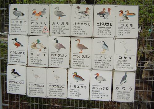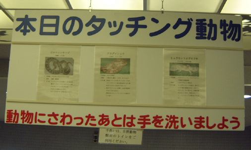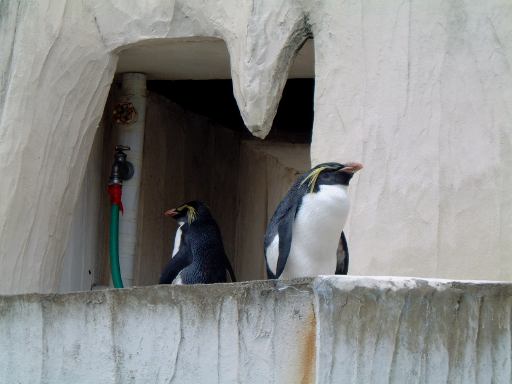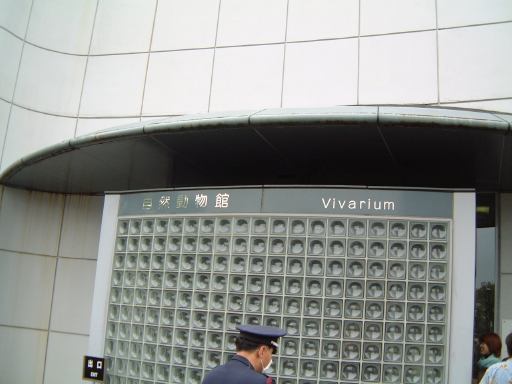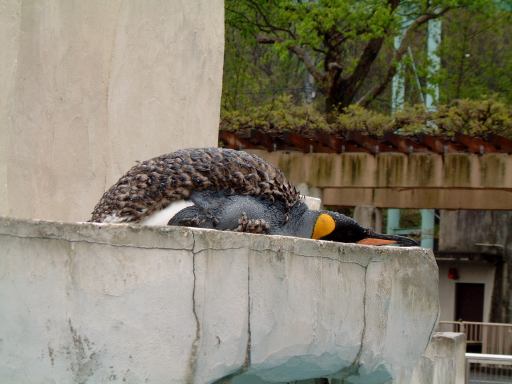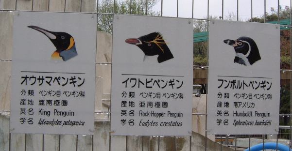 その先に進むと通路のまん中にペンギンたちが見えてきます。が全然動いている様子はありません。近づいてみてもイワトビペンギンは突っ立ったままだし、オウサマペンギンはうつ伏せ(毛皮を着てるみたい(実際に着てるけど)ですが、きっと毛の生え変わり中でしょう)だし、多くのペンギンがまるで人形のように固まっていました。それが人形じゃないと判るのは、たまにプルッとお腹が痙攣するときぐらいです。陸上ではじっとしているのがペンギンの習性なんでしょうか。南極から遠く離れた東山の空の下、一体何を思うのか・・って感じで哀愁さえ漂っています。このように無駄なエネルギィを使わないのは、寒いところに適応した結果かもしれませんね。ただ、フンボルトペンギンだけは泳いだり歩いたり比較的活動的でした。種類によってやっぱり習性は異なるようです。ちなみに、動物の檻にはそれぞれこういう看板が取り付けられていて、動物の名前や分類などが判るしくみになっています(当たり前?)。