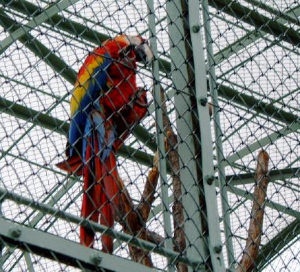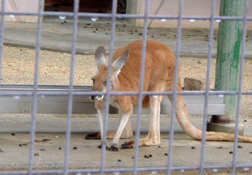園内にはところどころにこういった案内版が設置されていて、現在地と各動物のいる場所が確認できます(現在地がわかるかな〜)。この案内版の左側に行くと、満腹なのか大人しいヒョウが奥に居て、ガイドマシーンでは今度はものすごいうなり声が聴けるみたいです。その向側にはずっと鳴き声がうるさいコンゴウインコたちの大きな檻があり、近寄ってきたものもいました。羽の色は綺麗ですけど、うるさいのはちょっとゴメンですね。再びヒョウの居た側に向くと、カンガルーの檻があり、一匹だけ水飲み場に出てきていました。横の檻には、そのカンガルーよりもでっかいヒクイドリがいましが、逃げられてしまって写真は撮れず。