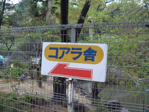 カリフォルニアアシカは、陸に上がって昼寝をしているものやプールをぐるぐる泳いでいるもの、そして水しぶきがかかってもゴメンねと謝っているものなどがいました。よく見るとさらにそのアシカは小声で何か言っています。近づいてみると・・こんなくらだならい駄洒落でした(笑)。「なんちゃって」っていうのもそろそろ死語かも。それはともかく、これで主目的は達成です。オットセイを見ることはできませんでしたが、無事に「アシカとオットセイの違いはいくらか」を確認できた一行は、その後の進路をどうするかということでしばらく案内版を前に迷っていました。東山スカイタワーはもうすぐそこに見えています。しかし、スカイタワーに向かう前に、やっぱり東山動物園のメインであるコアラは見ておくべきでしょう、ということになりました。そして、ちょうどエサの時間で姿を見せていたラクダの横の階段を上がったところにある、大きな池の南側に位置するコアラ舎へぞろぞろと向かいました。