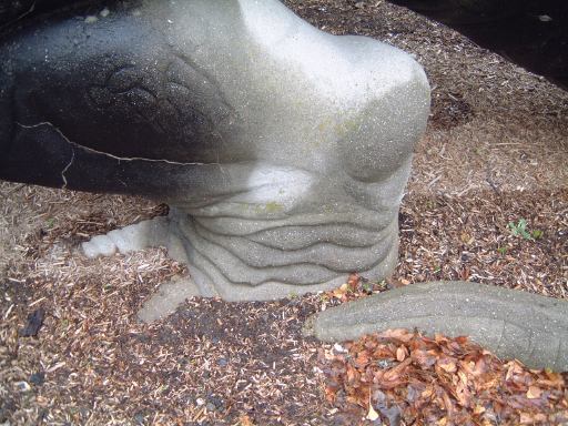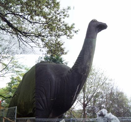 そこからはぞろぞろと売店の前を通り抜けて、今度は大きく反対側へと向かいました。依然として小雨がぱらついているのでみんな傘を差していますが、差さなくても平気なレベルなので差してない人もいます。そしていよいよ、本日の目的のひとつ、コンクリートでできた恐竜たちが居る池までやってきました。離れて見てもこの大きさです。トリケラトプスのしっぽの先には鳥が留まっていたりして、まるで古代の風景を見ているかのようです。この比較的小さな池には、様々な鳥たちが居るようですが、フラミンゴは判りやすいもののとても全部を確認することはできませんね。近くで見れたのは、フェンスそばでうろうろしていたオシドリ(ちゃんと2匹揃ってました)やサカツラガン(と向こうに見えるお姉さんたち)ぐらいでしょうか。また、ここには東山動物園のメインだと思われる(チケットにも描かれてるし)コアラが居る場所への適当な案内もありました(メインのわりに貧相な看板ですが)が、ひとまず裏に回ってコンクリート製の恐竜たちに近づきます。背中側から見たイグアノドンがこれで、足の皮膚の弛み具合を見ればその造型の凄さが判ります。とても60年以上も前に造られたものだと思えません。池に一部浸かっているトリケラトプスは不敵な笑みを浮かべています(笑)。Kつさんの説明によると、白くなっている部分は石灰化している部分で、目とかトゲトゲの部分はコンクリートとは別の材質でできているようです。もう一体、一番大きな恐竜がブロントザウルスでかなり見上げないと頭が見えません。その足元には最近造られたらしい、卵から出てくる恐竜の赤ちゃんの石像もありました。