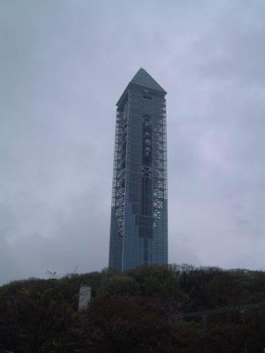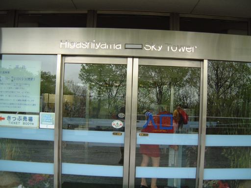エスカレータを降りると左手には自然動物館なる建物があって、その外側に設置されている水槽にはオオサンショウウオが居るらしいということで、みんなして覗いてみたのですがこのときは見つかりませんでしたね。捜索を諦めた一行は、いよいよその建物の向かい側にそびえ立つ東山スカイタワーへ、ゲートを通って入館することになりました。下から見上げたスカイタワーはこんな感じ。東山スカイタワーは基本的に動植物園とは別なので、ゲートを通ると動植物園からは出ることになるのですが、もう一度園内に入園する人のために整理券が渡されるようになっています。しかし前にいた親子連れが、800円の共通券は買ったけどもう半券を持っていないとかで、それでも入館させてくれないかと入口のお姉さんに訴えていて、後ろにいた那古野コネクションメンバ数人は立ち往生(苦笑)。共通券には動植物園に入園する用の半券とスカイタワーに入館する用の半券が付いていますが、それに気づかず入園してから捨ててしまったのかもしれません。きっとスカイタワーが動植物園の中にあるものだと思っていたのでしょう(たしかに知らない人はそう思うかもね)。そのやり取りが長引きそうだと判断されたのか、先に通してもらった我々は、入口からタワー内部に入りました。中でチケットをもぎってもらい、エレベータに乗るために並びましたが、ここのロビィには何故かキャラクタ物のビニル人形がたくさん置いてあり、その横で警備員が真面目に立っているという、なんだか不思議な空間となっています(笑)。エレベータを待っている間は、普通にしゃべったり、日本にあるタワーの数々の写真が載っているポスタを見ながらあれやこれやしゃべってました。このポスタには東京タワーや京都タワーはもちろん、名古屋テレビ塔や通天閣まであります。高さもそれぞれ書いてあって東山スカイタワーは134mであることが判ります。ここでKつさんに訊いてみて初めて知ったことですが、一宮市にあるランドマークタワーツインアーチ138の138mという高さは、「1・3・8」でやっぱり「いちのみや」から来ているそうです(ローカルネタ)。いやあ、まさかとは思いましたが、ほんとに市の名前で高さを決めていたとはね。ここはひとつ、これに対抗して兵庫県の西宮市には、ぜひ「にしのみや」にちなんだ高さ2438mの超高層タワーを建てていただきたいものです(笑)。