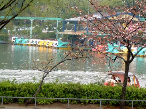 この大きな池は上池という名前で、ボートに乗って遊覧することができる池ですが、森先生の作品の中であの人とあの人が一緒にボートに乗った例の池ですね〜(にっこり)。「一緒にここのボートに乗ったカップルは別れる」というジンクスは、地元の人なら知らない人はいないというくらい有名だそうですが、この手のジンクスって日本中どこの池のボートでも言われているんじゃないでしょうか。たぶんほんとのところは、ボートという乗り物自体に何か問題があるのか(相手の真実の姿を見せてくれるとか)、行楽地では訪れるカップルの絶対数も多くなるのでそういう話も必然的に多くなるだけなのか、のいずれかなんでしょうけど。っていうか、この話題はあまり深く掘り下げたくないなあ(苦笑)<自分で下げたくせに。えっと、とにかくそのときは池にはほとんど客はおらず、足で漕ぐタイプのボートが数隻動いているだけでした。