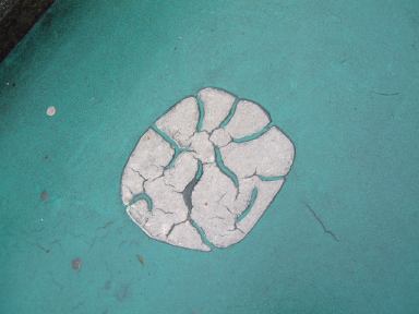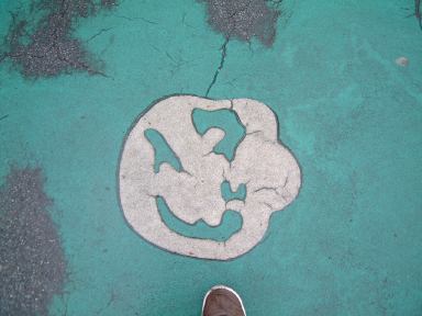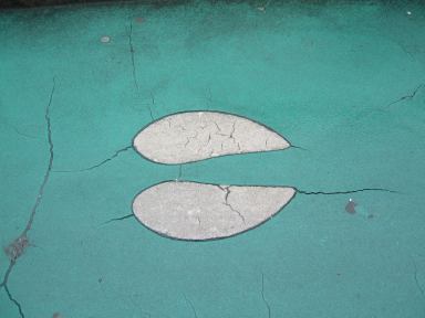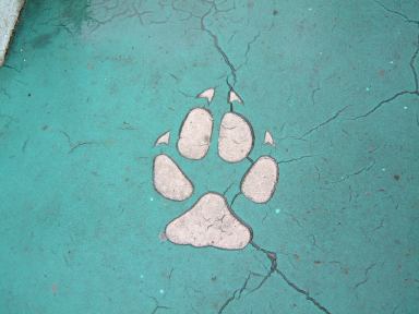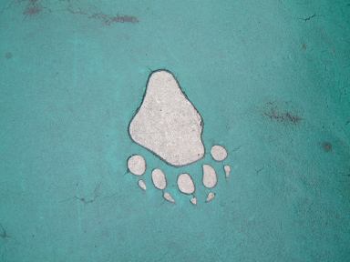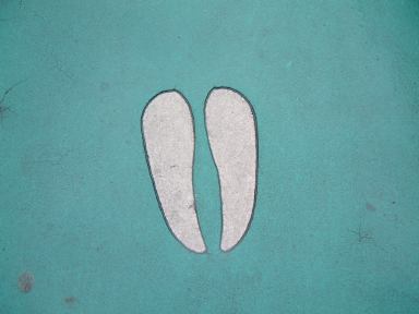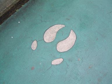 その後再びアシカのプール前を通り過ぎ、スカイタワーへ向かいました。そうそう、途中の売店には「フライポテト」と「スーパーフライポテト」が売られていたらしく、値段が同じなのにこの2つのポテトは一体何が違うのかというのを、MつるさんとMさんは気にしておられたようでした。というわけで「フライポテトとスーパーフライポテトの違い」をご存じの方はMつるさんまでご一報を(笑)。さて、今まで見てきたのは東山動物園でも本園の方で、そこから道路の上に掛かる夢園橋という陸橋を渡った北園側に、目指すスカイタワーはあります。しかしそこまでの道のりにも動物園らしくいろいろ趣向が凝らされていまして、橋に続く坂道には何やら点々と模様が描かれているのです。例えばこんなの。これがいくつか並んでいて、なんだろう?と思って辿っていくと、こういう看板に当ります。ああなるほどね、動物の足跡らしいと判るしくみ。この足跡は他にも、トナカイ、ツキノワグマ、タンチョウ、シカ、アフリカゾウ、トラ(指が写ってしまった)、アメリカバイソン、アジアゾウ(今度は足が写ってるぅ)、シンリンオオカミなんかがありました。そうやって一個一個撮ってるからみんなから遅れを取ることになるんですよね(笑)。気づけば、皆さんすでにスカイタワーへと続くエスカレータへと乗っていて(手前に写ってる家族は全然知らない人たちです、念のため)、あとを追いかけて長いエスカレータに乗り込んだしだい。昇り専用のようです。