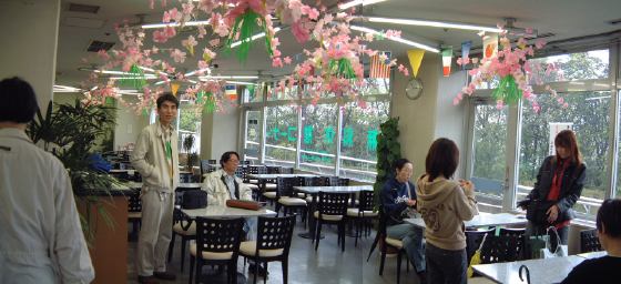 タワーの外へ出てみると、さっきまで居たはずのAなあなさんとSーなさんの姿が見えません。といっても二人が透明人間になったわけではなく(前にも使ったなこのパターン)、目撃者の話では二人はタワーから出たところにある階段を下りていったとのことでした。というわけで、残りのメンバも後を追って階段を下り、同じ道を辿っていくと、タワーに入ったときには見えなかった1階部分に無料休憩所がありました。でもってガラス張りの中を見ると、そこには姿を消しておられた二人が席に着いていて普通にしゃべっているではありませんか。はやっ。ご本人たちによると、こういうところの匂いには鼻が利くんだとか(笑)。それからは当然の流れとして、その休憩所で休憩&おしゃべりタイムとなりました。中の様子はこんな感じです。花の飾りがぶら下がっているのは春まつりだからでしょうか。我々の他には人がいません。各々自販機で飲み物を買って、初めのうちは女の子チームと男の子チームに自然と別れ、各テーブルで別々の話がなされていました。さて、こうして落ち着いてくるといよいよって感じがしませんか? 何がって、そりゃあもう、名刺交換ですよ(にっこり)。せっかく作ってきたのにお披露目せずに終わるのは悲しいでしょう?