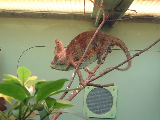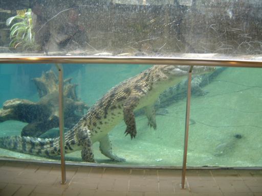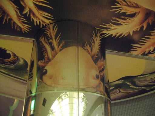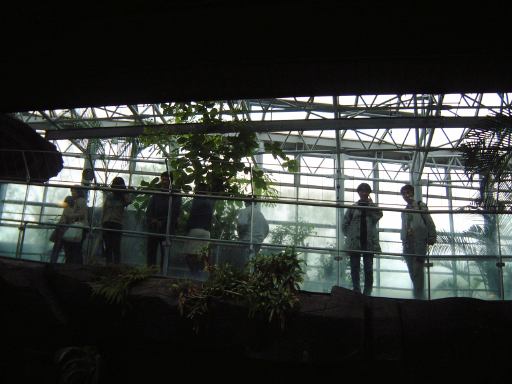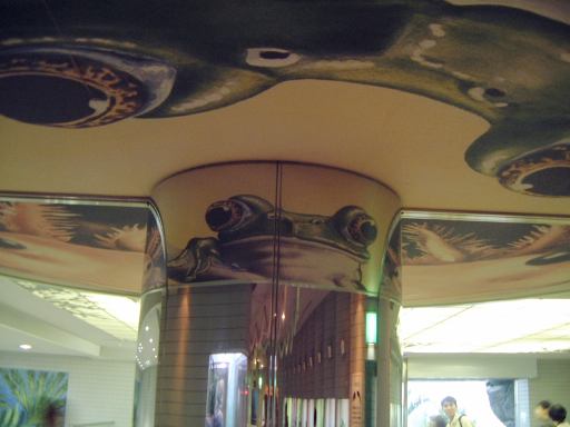 その後休憩所を出て、スカイタワーからも出て(つまり整理券を渡して動植物園に再入園)、向かいにあった自然動物館に入ってみることになりました。この建物には夜行性小獣や爬虫類や両生類などが居て、1階は夜行性の動物たちのフロアらしく廊下はこのように暗くなってます。結構いろんな種類の動物がいたのですが、暗くて写真はあまり撮れませんでした(フラッシュ禁止なので)。かろうじて撮れたものは、モコモコしているハリモグラとか、どぶの中が再現されているドブネズミの住処とか、ぶら下がったまま動かないフタユビナマケモノや、小さいわりに目が大きくて可愛いトビネズミなど。暗い廊下を抜けると1階ロビィに出てくるのですが、まず目立つのはこの二本足で立つナイルワニです(笑)。ガラスの向こう側には、先に進んでいた那古野コネクションメンバたちの姿も。追いかけてその場所に向かってみると、その空間は熱帯のようになっています。下にはアルダブラゾウガメや先ほどのワニを確認することができました。そこから建物の2階へ入ると、多くの爬虫類や両生類が並んでいるスペースになっていて、「本日のタッチング動物」なるものでニシキヘビが指定されていたり、鏡状の柱を使ったギミックでカエルやウーパールーパーが見えるようになっていたりします(子供の視線の方がより良く見える)。しかし、もう閉園まで時間もないということで、最後に近くにいたカメレオンに別れを告げて自然動物館をあとに。来るときはエスカレータで上がってきましたが、下り用はなかったので、動植物園の正門まで戻るために帰りは階段を降りてゆきました。案外長い階段で、Gんてつさんカウントによると全部で137段あったそうです。137は素数ですね(にっこり)。ここが一宮市なら、もう1段増やして138段にしていたところでしょう(笑)<まだその話をしてたのか。しかし名古屋市は同じことをしようとすると、あと621段増やさないといけないから大変ですね。