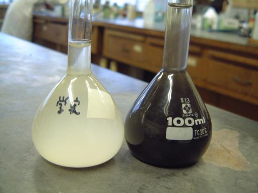 ちなみに、吸光光度分析というのは、溶液中の目的元素に試薬を反応させて発色させ、その溶液に特定の波長の光だけを通して吸収された(あるいは透過した)光の度合から元素濃度を求める分析方法です。あるものが白色光の下で色が付いて見えるということは、その色以外の色が吸収されているわけで、つまり、それを利用しているわけです。元素濃度によって溶液の発色の度合は異なるため、元素濃度が既知の標準溶液を用いれば、その吸光度と比較して未知試料中の元素濃度も判るという仕組み。学生実験ではリン(P)とチタン(Ti)の分析にこの方法を用いています。分析機械自体の大きさは小さくて、Xboxをひと回り大きくした感じでしょうか(笑)。