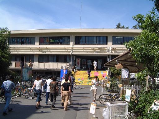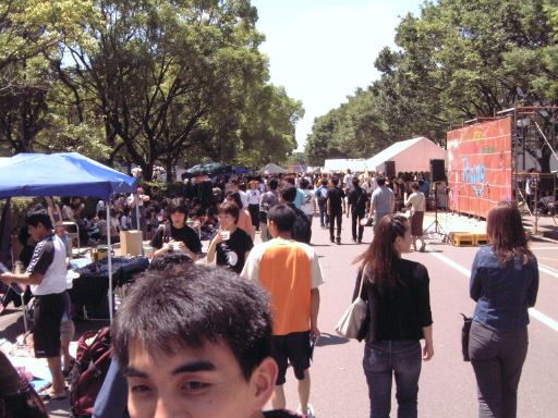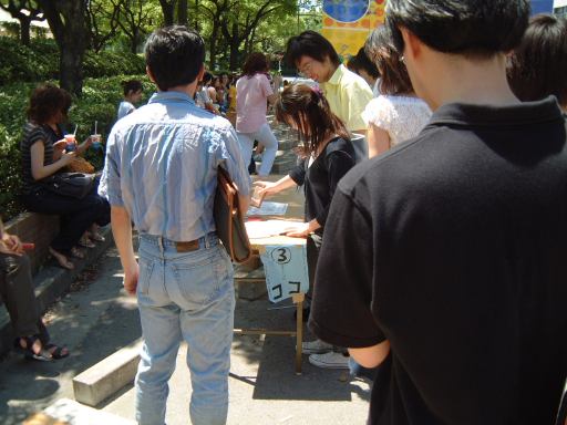 中央図書館を出たあと、次は再び最初の構内道路に出て、さらに西へと向かいました。その突き当たり近くに目標とするスタンプがあります。模擬店の呼び込みをかわしつつ、突き当たりまで行ってみると、比較的大きなステージ上で何やらカップルのコンテストが行なわれていました。何が良かったのかは不明ですが、そこで優勝したらしいカップルには高級ホテルのお食事券が授与されていましたね。しかしそんなことには目もくれず、我々はひたすら3番のスタンプを捺し続けます。このときラッキィな何人かは、近くの模擬店から無料で配りに来たかき氷をゲットしてさっそく喉を潤していましたね〜。ええと、関係ないですが、ステージ上の司会者の二人の意味不明のパフォーマンスには、観客もしらけムードであったことを付記しておきましょう(<またいらんことを言う)。