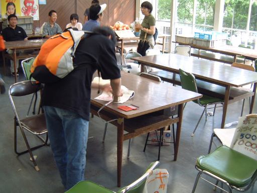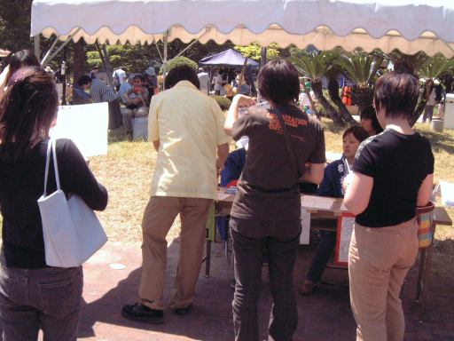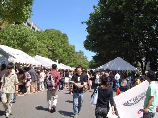 今度はさきほど横切った構内道路を西の端から東に向かって歩きました。目指すスタンプのあるところまでそれほど距離はなかったのですが、模擬店が軒を列ねるこの道路を進んでいくのにはなかなか苦労しました。でもってスタンプを見つけるのにも少々時間がかかりましたが、文学部前の仮設休憩所(といってもテーブルと椅子があるだけ)にて愛しのスタンプちゃんを発見。ここは孤独の7番です。もはやすっかり慣れた手つきで順番にスタンプを捺します。相変わらず陽射しは強く風も強いです。そろそろ喉が渇いてきますねぇ。風に乗って、たこ焼きや焼そばの香りも漂ってきます。昼食を食べていなかった人はお腹も空いてくる頃でしょうか。だからというわけではありませんが、ここでKつさんはわらびもちを買って食べられ、AなあなさんとGんてつさんは麦酒を早くも飲んでおられ、近くでは大道芸をやっていて、それが気になっていたメンバも何人かいましたね。麦酒はあまり冷たくなかったみたい。そうそう、書き忘れていましたが、スタンプは一枚の絵が12分割された形になっていて、全部を集めるとその絵が完成するという趣向らしく、この段階になるとだいたいの全体像が見えてきていました。どうやら描かれているのは今回の名大祭のマスコットキャラクタらしいかける君のようです。ちなみに、パンフレットの説明部分によると正式名称は「空をかけるくん」みたいですが、スタンプには「夢をかける君」という名前が書かれているのです。ま、どうでも良いことですが(笑)、一応、どっちなの?とここで突っ込んでおきましょう。