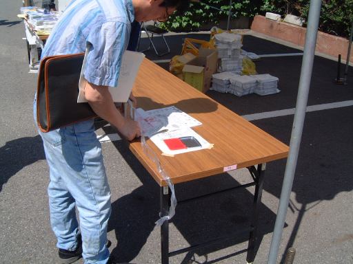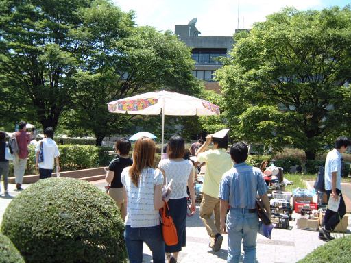 この構内道路にはずっと両側に模擬店が並んでいて、音楽関係のパフォーマンスをする舞台も設置されています。西側に延びるこの通路の奥を望むとこんな感じです(手前に写っているのはだれ?)。パンフレットのスタンプ設置場所を確認して、だいたいのルートを設定。まずは模擬店を見ながら西に向かって少し歩き、途中で青空講演会やフリーマーケットが開かれているグリーンベルト内に入りました。その入口付近に9番のスタンプ発見。すかさず並んで全員がスタンプを捺しにかかります。こんなことをしてる人が他にいるのだろうか、なんて一瞬思ってしまいましたが、その隙に子供たちに順番を抜かれていました(がーん)。なるほど、子供たち(とその親)がライバルなのか。気を引き締めていきましょう(笑)。陽射しが強い空の下、ひとつ目のスタンプを捺してすでにスタミナ切れの予感(早いな)を感じつつ一行は、そのままグリーンベルトをフリーマーケットを横目に見つつぞろぞろと西に進み、中央図書館へと向かいました。作品の中では場所が変えられて記述されていますが、ここは犀川先生があの人に会った場所であり、紅子さんが調べものに来たりした場所ですね(にこにこ)。この中央図書館は部外者も中まで入ることはできるのですが、申請の手続きが面倒なので入ったのはロビィ止まりでした。(追記:ネタバレになってしまうかもしれませんが、とある筋からの情報によりますと、紅子さんがよく足を運ぶ方の図書館は現在ではN大学博物館になっている旧古川総合資料館である可能性が高いです)