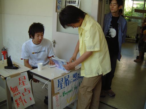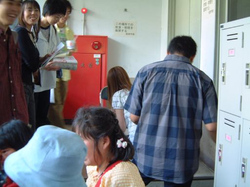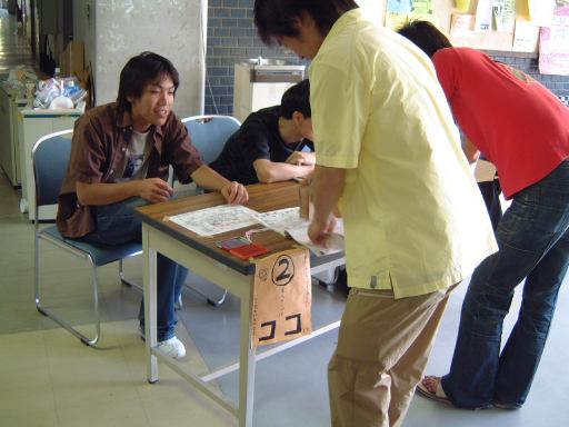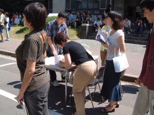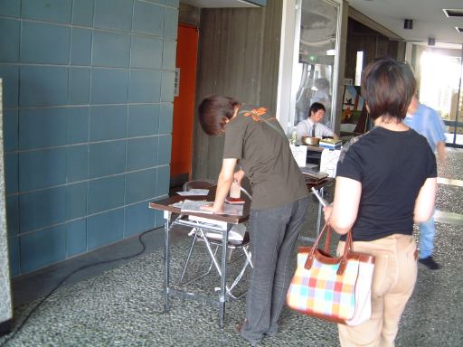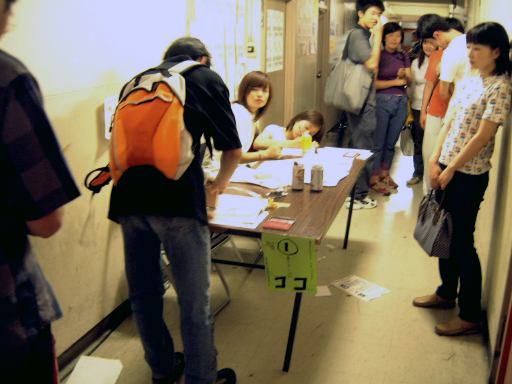 その後我々那古野コネクション一行は、もう少しこの道路を東に進んで、経済学部の建物の中に入っていきました。スタンプが置かれているのは、たいてい何らかの出し物をしている会場の近くなのですが、ここではお化け屋敷と化しているらしい大きな講義室の前にスタンプはありました。しかし、このお化け屋敷が何故かすごい人気で、長蛇の列ができているのです。最後尾ではもういっぱいなので並ぶことはできないよというアナウンスが行なわれているほどでした。とはいえ、並んでいるのはほとんどが小学生くらいの女の子でしたね(だから何?)。若干、カップルもいましたが、羨ましい限りです。もちろん、涼しいところに入ることができて、という意味ですが(笑)。そんな行列の横をすり抜け、8番のスタンプがある場所に辿り着くと、すぐさまノルマを達成するべく捺す作業に取りかかりました(隠れていますがパイプ椅子の上に置いてあります)。ちなみに誰かさんにこちらが笑われているのは、これを撮る直前に目の前にいた子供がピースサインをして写りたがっていたのを、ダメダメと首を振ってカメラマンがむげに断ったからです。社会の冷たさを思い知ったでしょうか(わはは)<大人げない。