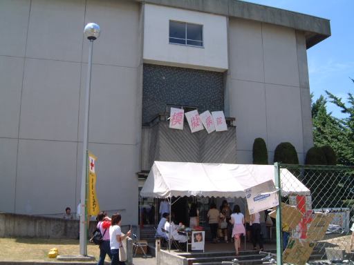 そのあとは、共通教育棟を目指し、中央図書館裏のグリーンベルトを通って南側の構内道路に出ました。こちらも模擬店がたくさんあって人がわんさかいます。とりあえず一行は道路を横切り、そのまま共通教育棟へと入っていきました。ようやくここで、「ぶるぶる人形にうってつけの夜」の舞台のひとつが登場です。ネタバレになってしまうので詳しいことは書けませんが、スタンプを捺しに行くついでに3階に上がり、窓からこの中庭を見学することができました。たぶんあの辺りであれがああしてああなったのかなぁ、などといろいろ想像を膨らませつつ、やはりスタンプ捺しに励む一行(笑)。ちなみにスタンプは6番でした。この部屋にはNゲージの鉄道模型がぐるぐると走っていましたが、鉄道模型以外の周りの模型がチープ過ぎたような気もします。所詮、大学祭なんですね(しみじみ)。それから向かったのは、同じ共通教育棟の1階にあった教室で、星占いをしてくれるところでした。そこへ向かう途中で、さきほどの中庭を見るとこんな感じです。やがてその占いの教室前に到着。しかし、欲しいのはただ5番のスタンプのみだった我々は、しっかりとスタンプを捺すだけ捺して、共通教育棟をあとにしました。一撃必殺ですね。そして建物の西側から出ると、目の前には次に目標としていたスタンプ設置場所である模擬病院の建物が現れました。わぁ、模擬病院って何をしてくれるんだろうと期待に胸を膨らませ(<勘違いしてないか)、興味津々というか不安を覚えたのですが、幸いにもスタンプはこの建物の入口前に設置されていたので、血を採られることもなく、全員無事に4番のスタンプをゲットすることができました。そして、いそいそと次のポイントに向かいます。