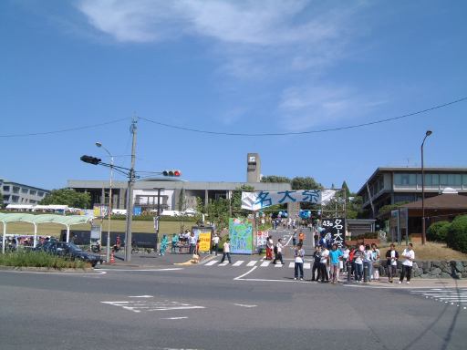 毎年、名大祭の時期は天気が今ひとつで、何もこんな時期にせんかてええんとちゃうの?という疑問が湧いてくるのですが、この日は珍しく快晴で、風は少し強かったもののまさにカーニバル日和といった感じでした。N大学は道路を挟んで東側と西側にキャンパスがありますが、東側の道路沿いにある郵便局前に集まった一行は、ひとまず歩道を南に移動し、バス停の手前で道路を渡り、名大祭のメイン会場となっている西側に向かいました。この辺りは中央図書館の裏まで続くグリーンベルトと呼ばれる広場みたいな場所を挟んで、北側と南側に広い構内道路が通っていて、それぞれの通路沿いに、北側には工学系の建物が、南側には経済や文学系の建物が位置しています。ぞろぞろと歩きながら一行は、「名大祭」と大きく書かれたゲートをくぐり抜けて、北側の通路からキャンパス内に足を踏み入れました。するとどうでしょう、天気が良いせいか、いつになく大変な賑わいになっているではありませんか。明らかに外部からの来場者が多いです。名大祭ってこんなに人が来るもんだったのか、と少し感心。研究室のある東側のキャンパスに居たら全然感じられませんからね(笑)。しかし、子供やおじさんおばさんが目立つこともあって、大学祭というより町内のお祭りみたいな雰囲気になってます。ゲートを入ってすぐのところに、名大祭の本部テントがあり、そこではパンフレットも配られていたのですが、ある文字が我々(というかKずえさんか)の目を引きました。それは「1等 東京ディズニーシー・ペアチケット」。どうやらパンフレットの専用ページに、N大学内のあちこちに設置されたスタンプを捺して集めてくじを引いて当たればもらえる賞品のようです。いわゆるスタンプラリィというやつですね。スタンプは全部で12個。9個集めて1回、12個なら2回くじが引けるとのこと。ちなみに2等は大きな犬のぬいぐるみでした。うう、これはもう参加しないわけにはいかないでしょう。12人いるわけですから最高で合計24回くじが引ける計算になります。こんなけいれば誰か当たりますよぅ、と言う係の人の口車に乗せられ、我々はみんなでこのスタンプラリィに参加することになりました。どうせ大学内を歩いて回る予定なんですから、ついでにスタンプ捺したってバチは当たらないでしょう(笑)。こうしてディズニーシーのチケットを手に入れるべく森ミステリィの舞台を巡るべく、N大学探索の旅の一歩を踏み出したのでありました。