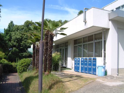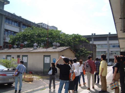 農学部を出てからは構内道路を西に進みます。理系カフェテリアや旧理系こと理系中華食堂の横を通り過ぎ、今度は工学部4号館・5号館のある一帯へ入りました。そして、まずは4号館にある森先生の研究室を見上げる不審な集団です。それから、数々の機械類が森先生に拾われたという粗大ゴミ捨て場や、その隣のコンクリート捨て場までもじっくり見学するというマニアックさ(笑)。良いですね。大学祭の日にこんなところを見ているのは我々だけでしょう。そうそう、実はここの建物は「ぶるぶる人形にうってつけの夜」の最後の舞台になったところなのですが、スタンプラリィのタイムリミットが迫っていたこともあり中に入って現場を確認することなく先を急ぐことになりました。ここまで頑張ってスタンプを集めてきて、結局時間切れというのは痛いですからね。というわけで、そこの工学部の建物は通り抜けただけで、建築学科の前の自動車用の出口にある犀川先生が頭をぶつけたバーを見た後、近くの横断歩道から道路を渡り、再び西側のキャンパスに入りました。少し行ったところに工学部7号館があります。その中の入ってすぐのところに、2番のスタンプはありました。いつものようにスタンプを捺している間、受付の人に展示を見ていってくださいと頼まれましたが、スタンプラリィの時間がもうないことを理由にしてスッパリ断るのでありました(うはは)。次行ってみよう。