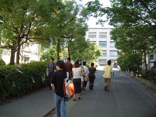 そこからは、一路北に向かって下り坂をほぼまっすぐ下っていきました。来た道とは違って、理学部方向へ直接出ることのできる道でした。そろそろ歩き疲れてきた感のある足取りでしたが、ここまで来たらすべてのスタンプを集めないわけにいかないでしょう(なんってったって2回くじが引けるんだから)。この時点で残すスタンプはあと3つ。そのうちのひとつがこの先の農学部の中にあるのです。それを目指してひたすら歩き、理学部をかすめて大学の一番北側に位置する構内道路との交差点で右折、少し歩いたところで左に入り、談話室らしきところに12番のスタンプがありました。ここでは農学部で作ったらしい牛肉の販売がされていて、那古野コネクションのみなさんは口々にステーキ肉が安い安いとおっしゃっていましたが、普段肉を買わない自分にとってはよく判りませんでしたね(うーむ)。ただ、一緒に売られていたタマネギやジャガイモが確かに安かったのは判りました。こうやって安い安いと言ってはいましたが、やはりここでもスタンプをゲットしたら何も買わずに退散する首尾一貫した信念を持ち続ける一行でありました。まあ「ディズニーシーのペアチケットを手に入れるぞ!」という程度の信念ですけど(笑)。
