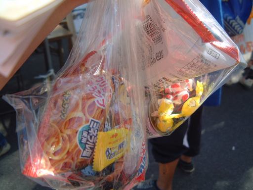 いよいよ最後となったスタンプの場所は、7号館からさらに西に行って北側の突き当たりにある学生会館でした。サークルなどの部室が割り当てられている建物ですね。中に入るとどこかで演奏しているらしいバンドの音楽が大きく聞こえてきます。2階にスタンプはあったのですが、音の発生源はここのようでした。音と人がごちゃごちゃと混ざった中、手早く順番に捺印を済ませて、学生会館をあとにした一行でした。あとは最初に訪れたスタンプラリィ受付本部のテントに戻ってくじを引くだけです。しかしみんなの足取りはもうくたくたの様子(苦笑)。なんか青春時代が終わった・・みたいな哀愁さえ漂っています。結構長い距離を暑い中歩き回って、お世辞にも元気があるとは言えない状態になっていた一行でしたが、そんな我々にさらに追い討ちをかけるような衝撃的事実がこのあと待ち受けていたのです! 受付に辿り着いたとき、タイムリミットの午後4時にはまだ時間がありましたが、すでに1等と2等の賞品の姿はそこになかったのです(がーん)。はは・・あはは・・、はぁ(溜息)。そうだよねぇ。この時間帯だものね。やっぱりそうなるのが普通だよね・・。まあ、ある意味予想通りのオチではありましたが、いざ直面するとがっくりきます(ガックシ)。ディズニーシーのチケットはおろか、犬のぬいぐるみすらなくなっているとはねぇ(溜息)。くじを引くのも張り合いがありませんでしたが、2回分引いてみんな4等とか5等を当てていました(というかほとんど参加賞みたいなもの)。もらったのは、こんな袋に入れられたお菓子いろいろと缶のお茶でした。残念ながらディズニーシーには誰も行けませんでしたが、食べ物がもらえただけでも、まあ、スタンプラリィに参加した価値はあったでしょうか。N大学内もまんべんなく回れましたしね。森先生の講演会が無くて物足りなさが感じられてしまうとはいえ、最近では珍しく賑わっていたし、なかなか楽しめた大学祭だったと言えるでしょう。主催者にはこの場を借りて感謝したいと思います。ありがとうございました(確実に見てないだろうけど)。