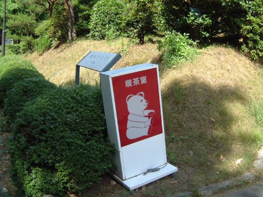 ロビィでの10分くらいの休憩も終わりT講堂を出た一行は、さらに東の奥地へと向かうことになりました。スタンプの場所まではかなりの距離があります。そこへ行くまでに作品舞台の確認もいくつかしておきたいところです。そう、それが本来の目的じゃないですか(笑)<何を今さら。というわけで、まず向かったのは急な坂を登って交差点で左の道に入りしばらく進んだところにある、喫茶店というか喫茶室でした。このキャラクタから、ここが森先生の作品に何度か登場するあの「ホワイトベア」だと推測されるのですが、実はもう少しちゃんとした喫茶店が、すぐ近くのT講堂裏にあって場所的にはそっちの方が「ホワイトベア」に近いかなあという気がしないでもないです。でもまあ、少なくてもこのキャラクタが「ホワイトベア」という名前の由来になっているのは間違いなさそうです。そして、このキャラクタに過剰な反応を示したのはクマ好きのKずえさんだったことも、間違いなさそうです(笑)。キャラクタはホワイトベアですが、実際にはここは職員向けの食堂みたいなところで、特に名前があるわけでもありません(あるとすれば「職員クラブ」かな)。 日曜日なので当然開いていなかったのですが、それでもメニューをチェックしに入口付近までぞろぞろと近づく我々の姿は、かなり怪しかったことでしょう(大学祭に関係ない場所だしね)。(追記:再びとあるN大学OBからの有力情報によりますと、やっぱりこの職員クラブの喫茶室が「ホワイトベア」と呼ばれているんだそうです)