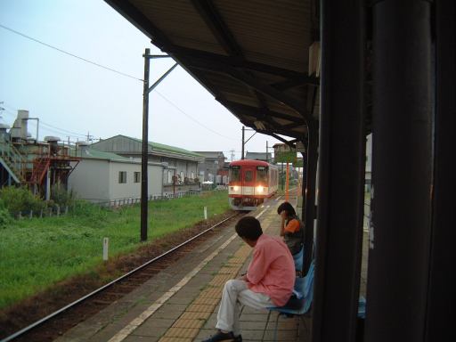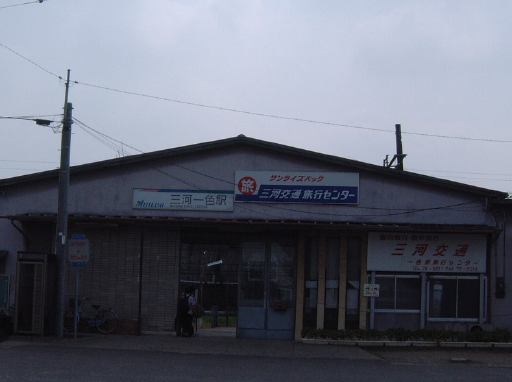 金山駅の名鉄の改札口前に行ってみると、すでに幹事のKずえさんがおられました。基本的には一色港で集合だったのですが、何人かは金山から集まって行くことになっており、どうやらその組の待ち合わせで待っておられたようです。もともと単独行動で一色港まで向かうつもりでいましたが、ここで会ったが百年目(<遣い方間違い)、同じ電車に乗ることにもなるというわけで、ここから同行することになりました。しばらくしてMつるさんとAなあなさんとAさんが合流し、それぞれ切符を買って改札口を通りホームへ。さらに目的の電車がホームに入ってくるというときにタイミング良くFさんが登場され、6人でまずは碧南行きの急行で碧南まで向かいました。睡眠不足で眠かったものの、AさんもFさんも男性陣は座ろうとしないので、席が空いたあとでもなんとなく意地でも立ったままでいようと頑張ってしまいましたが(苦笑)、最後の最後で席がガランガラン状態になったとき観念して座ってうとうとしました。そこでFさんからは三重土産の海老せんが振る舞われたりもして、やがて終点の碧南に到着。ここで吉良吉田行きの普通に乗り換えたのですが、ディーゼルカーでワンマンの1両編成なので、電車でもなく列車とも呼べなくて困ります(一般にはなんて呼ばれているのだろうか)。周りの風景も相まって田舎を感じさせてくれる車両です。この車両の中で、LさんとMさんとも合流し、8人となった一行はワンマンカーに揺られながらゆっくり目的の三河一色駅を目指しました。途中吹きさらしの鉄橋なんかがあって迫力満点の路線です。で、三河一色に到着したのが10時頃。ちなみに乗ってきた車両はこんなやつで三河一色駅の外側はこんな感じ(暗いのは逆光のせいですが、実際寂れてはいます)。