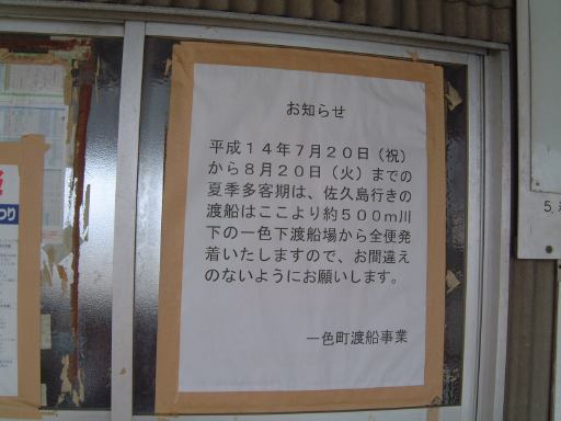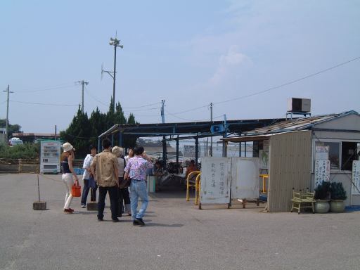 人っ気のない駅前から一色港の渡船場までは歩いて15分くらいです。途中にはこういう案内板があり、信号のある交差点を右折して川の手前で左折するとこういう土手道が続いていて、すぐそこに見えるのが船の乗り場のようでした。しかし、着いてみたら繁盛期の夏はどうやら乗り場が違うらしく、こういう貼り紙がしてあります。うーん、そうだったのか。というわけで、さらに500メートル川下に下ることになりました。だんだん強くなってきた陽射しに早くもやられ気味で、トボトボと歩く一行です(笑)。川に並ぶ漁船を眺めながらのんびり歩いていくと、比較的大きな渡船場が見えてきました。道路脇には沢山の駐車中の車があります。やはり結構島に渡る人はいるようです。海水浴場もあるらしいのでそのお客さんが多いのかもしれません。さらに近寄るとこんなふう。ここで、1時間近く早くに来ておられたらしいGんてつさんと、今回那古野コネクション初参加となるAすましさんとも無事合流できました。これで全員が揃ったことになります。総勢10名です。あるいはA0名か(にこ)。今回は会計係をGんてつさんがしてくださることになっていて、まずはバーベキュー代なども含めた一日分の代金として各自4000円ずつ預けて、Gんてつさんに乗船チケットをまとめて購入していただきました。その後、乗船までの間の時間を利用して名刺交換を少し。それから銀のエンゼルも2枚ほどお預かりしました。着実に貯まってますね。