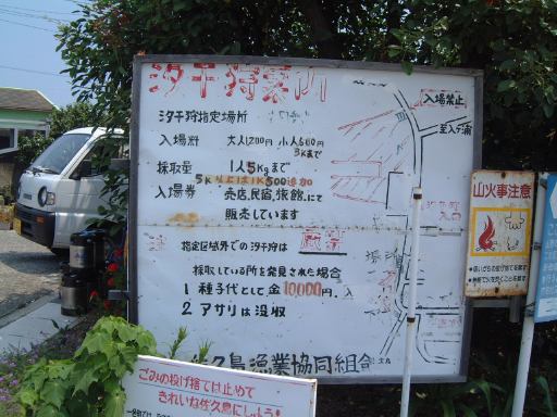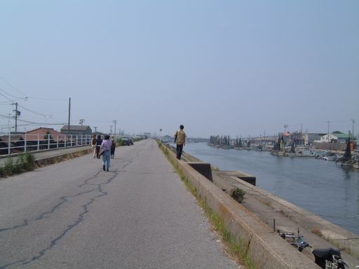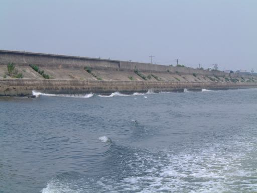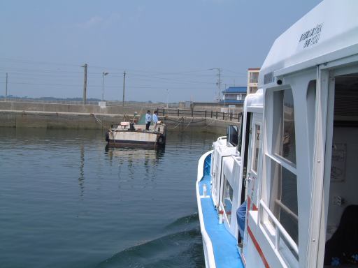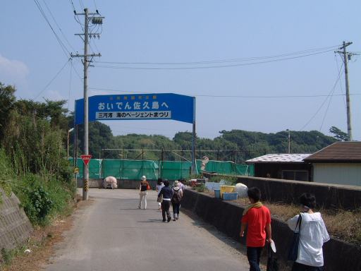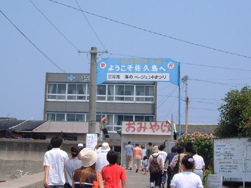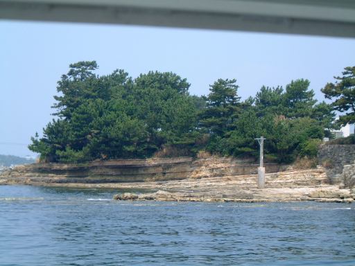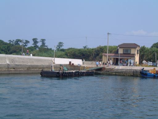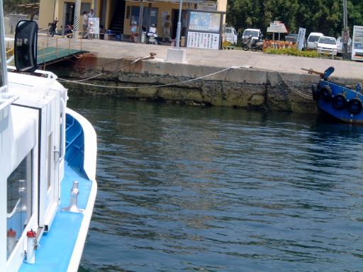 そしていよいよチケットをもぎってもらってこの船(はまかぜ)に乗船、午前10時40分に出航となりました。船上では心地よい風が吹いていてわりと快適です(室内は冷房も利いてるみたいでした)。海側を望む景色とか足元の水面とか、ついつい意味もなく写真を撮ってしまうほど清々しい感じです。船が動き出して後ろを眺める親子も清々しいです。前方を見るとこんな感じで、船の走ったあとの波が河岸の壁にぶつかっていく様はこんなふう(波マニアに捧ぐ)。河口近くになると魚市場らしきところがあり、内港を抜けると船は一気にスピードアップ、灯台もあっさり通り過ぎ三河湾へと出ていきました。船上ではエンジン音がうるさくて普通に会話することは困難でしたが、風はますます心地よくなりました。乗り出すと迫力満点です(<乗り出さないように!)。後方の波もより大きくなってます。風に髪をなびかせ子供に見つめられるお姉さんも絵になってます(笑)。途中どこからともなく現れたモーターボートが、我々の船が作った波で飛んだり、小さな島や遠くに日間賀島(?)が見えたりして、15分ほどで佐久島の西渡船場に到着。しかしここではまだ降りないので、そのまま船と一緒に港を離れ、島の東側へ。どうでもいいですが船の操縦席はこんな感じで丸い羅針盤がかっこいいです。と目を逸らしているうちにすぐに船は東側の渡船場に近づきスピードダウン。途中地層が分かりやすいこういう露頭なんかも見えます。近づくとこんな感じ(地質マニアに捧ぐ)。そして東渡船場に到着。そこでみんなワラワラと下船。島の飲食店や旅館の関係者なんかも荷物を運ぶためかそこに居て賑やかです。でもって降りたところには歓迎の看板。さすがにこれは妃真加島には無さそうですが(笑)、歓迎されて悪い気はしませんね。ただし同時にこういった看板もあり、指定区域外のアサリの持ち帰りは歓迎されていないようですが(ちなみに大アサリはこの島の名産のひとつ)。なにはともあれ、こうしてついに我々は伝説の地(<いつから伝説に?)に一歩を踏み出すこととなったのであります(Aすましさんは昔訪れたことがあるとのことでしたが)。
