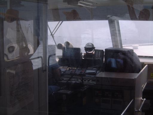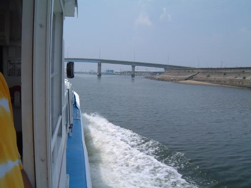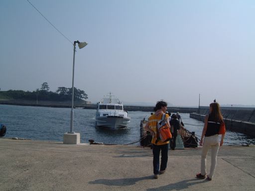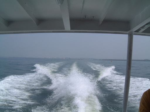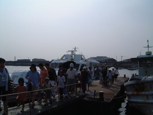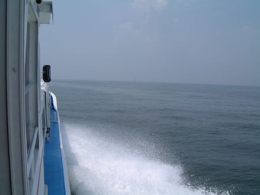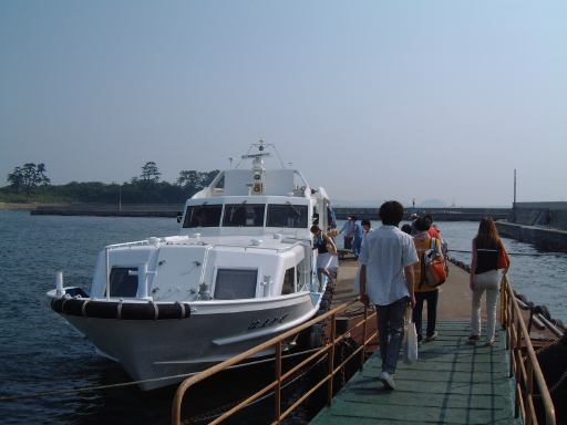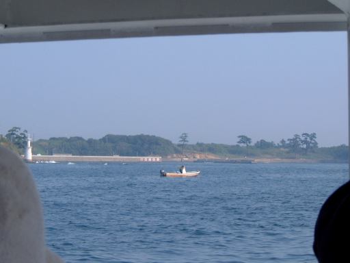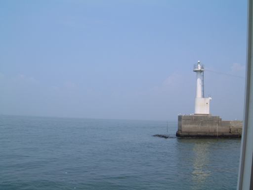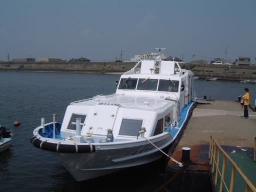 集合場所は犀川研のメンバも集まった一色港で、集合時間は島への定期船の時間に合わせて10時半という比較的早い時間でした。そこまでの道のりも名鉄を乗り継いで結構な時間がかかるため、今回はいつもよりかなり早く家を出る必要があったわけです。まずはN大学前からバスに乗って金山駅へ向かうつもりだったのですが、いきなりこのバスが時刻表に載ってる時刻を過ぎてもなかなか出ようとしやがりません。バスは待機していて運転手も中にいるんですが、後部座席の方で煙草をいつまでも吸っている風なのです。おいおい、ちゃんと時計見てるのか? いくらなんでも5分は遅れ過ぎじゃないか。時間を勘違いしているとしか思えない勢いです。くっそーこのせいで名鉄に乗り遅れたらどうしてくれるんだ。もし乗り遅れた場合、一色港の集合時間に間に合うかどうかが微妙だったため、気持ちはどんどん焦ります(イライラ)。早く!早く!早くバスを動かしてくれ! そう願いつつ時刻表から遅れること約10分、ようやく運転手はバスをバス停に入れ、乗り込むことができました。朝からヒヤヒヤさせられましたが、結果的には休日だけあって道路は空いていたので、乗ろうとしていた名鉄の出発時刻までには余裕で間に合いました。良かった良かった。しかし、もうちょっと運転手さんには時間を守ってほしいものです(せめて始発の停留所ぐらいでは)。