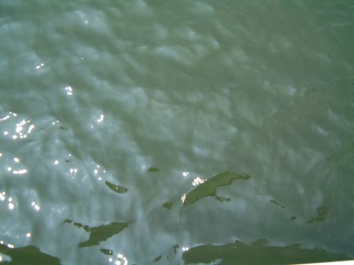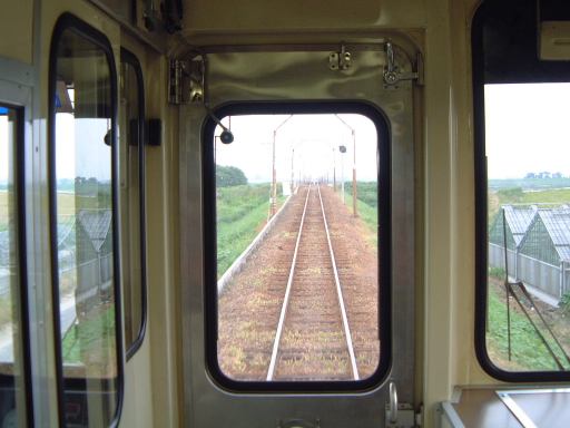 すると意外にも結構多くの人が乗っています(<失礼な)。この車両は碧南行きでまずは碧南まで戻ることとなりました。行きにも通った途中にある吹きさらしの橋ですが、渡ってるときに窓から外を見下ろすと、こんなふうに仕切り無しに川が見えてちょっと怖いです(解りづらい?)。どんな橋かをぜひとも見せたかったので、渡り終えてから急いで車両後方の眺めを撮ったのですがあえなく失敗写真。すでに橋からかなり離れてしまって見えませんね。碧南で急行に乗り換えると、今度は知立行きでした。つまり金山まではもう一度乗り換えが必要ということです。久しぶりに歩き疲れたのか、この電車の中では座れたこともあって堪らず断続的に寝てしまいました。その横ではAさんがGんてつさんから借りた例のキャストパズルを一所懸命解き始めておられます。さてさて終点までに解けるのでしょうか、なんて思いつつ寝ているうちに知立に到着。キャストパズルはまだ解かれていませんでした。どうやら次の電車に持ち越しのようです。ここでMさんとは別れ、次は特急で金山まで戻ることに。名古屋が近づくに連れて人の数は増え、車両内はすでに満員でした。そこに乗り込んだ我々はもちろん立ったままでしたが、Aさんはずっとキャストパズルを続けておられたらしく、金山到着直前についに解くことに成功された模様。おめでとうございます〜(にこにこ)。